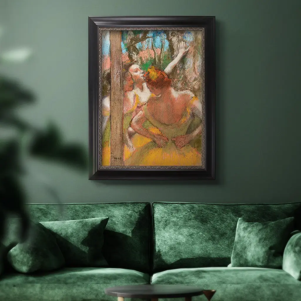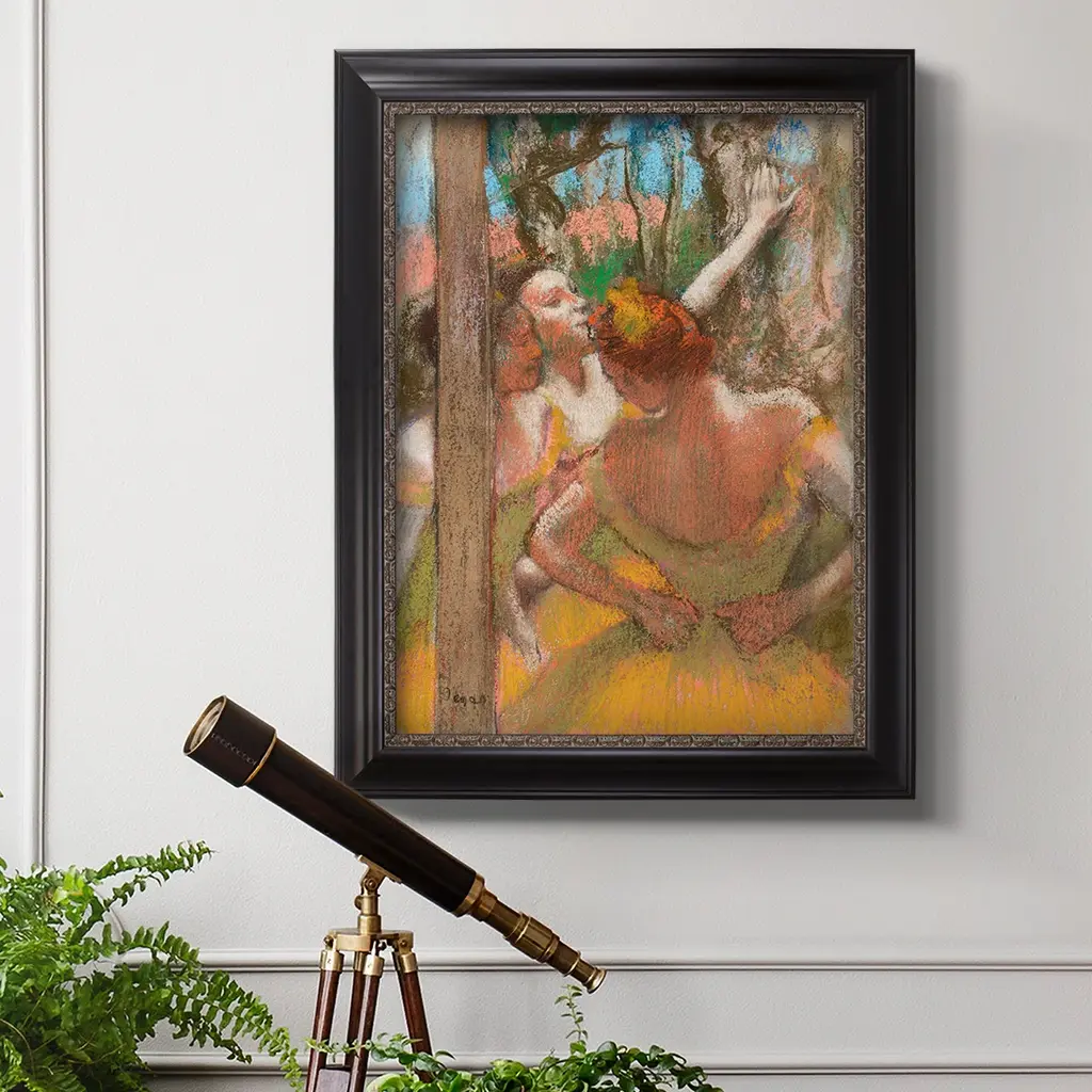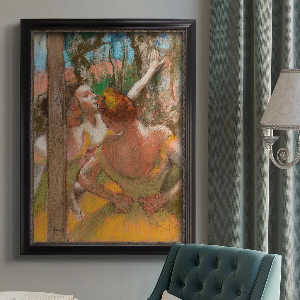 degas dancers 1896 Premium Framed Canvas- Ready to Hang A Premium Framed Canvas created to last. Framed in distressed wood and available in an array of sizes and colors Featuring a beveled a solid wood stretcher bar, each piece comes ready to hand 3 SIZES AVAILABLE 16''X20'' - Overall Size 18'X27'' - Overall Size 24''x36'' - Overall Size Each piece is made to order. Each piece comes with hanging hardware. Made in the USA Ready to Hang Giclee Paper Print Acrylic Glass Beveled Matt Board