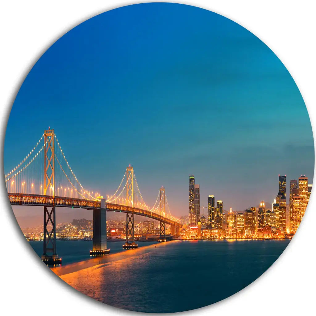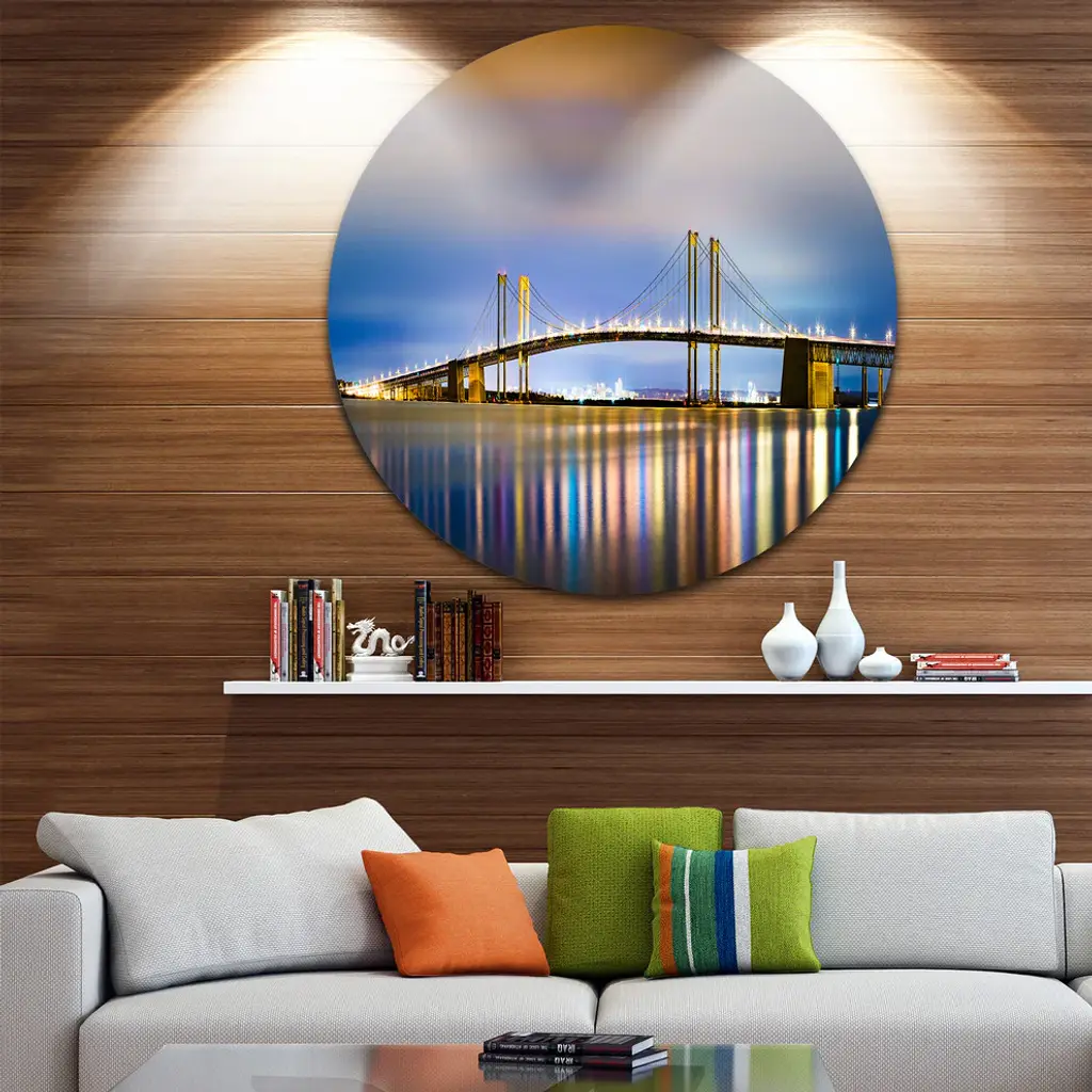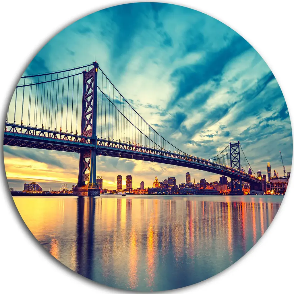 Bring Contemporary Abstraction to your home with this large Circle Metal wall art. This Delaware Memorial Bridge Panorama Metal Artwork makes it the focal point of any room or office. - White Gloss Coating ensures colors are extra vibrant with light reflection.- Aluminum grade Sheet Metal with 1 inch mounting frame on the back giving the illusion that the artwork is floating on the wall..- Mounting Brackets are included along with instructions.- High Quality Digital images are created directly into a glossy aluminum panel producing a stunning and captivating print into the glossy finish of the metal.- Water, Fire and Scratch resistant HD Aluminum panels.- Looks better than any photo paper and guaranteed to last at least 20 years- Easy to clean with a microfiber cloth. Colors are far superior to regular Canvas Art. - Easy to Hang