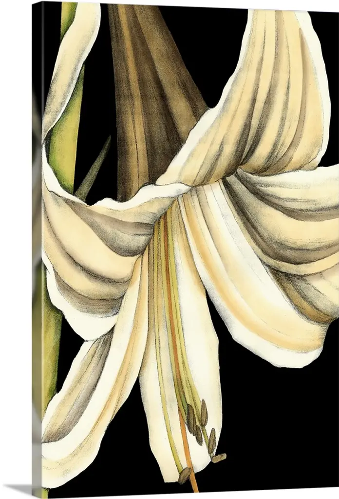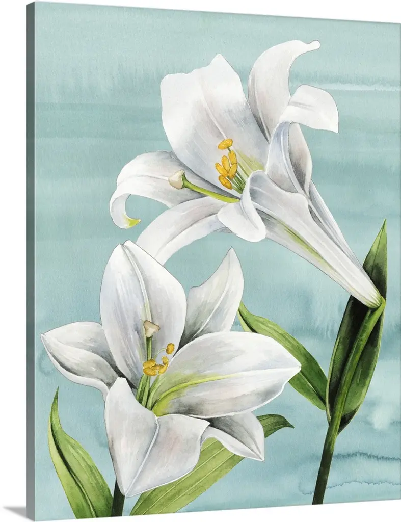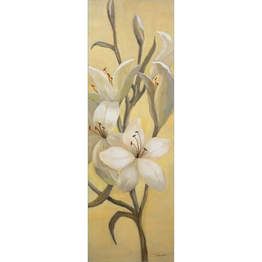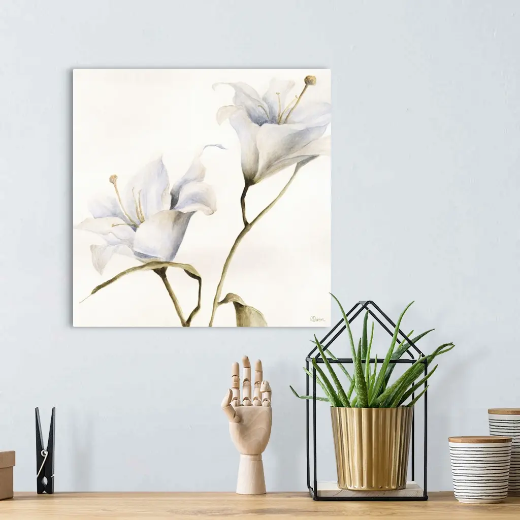 Contemporary painting of a white flower on a leafy stem.