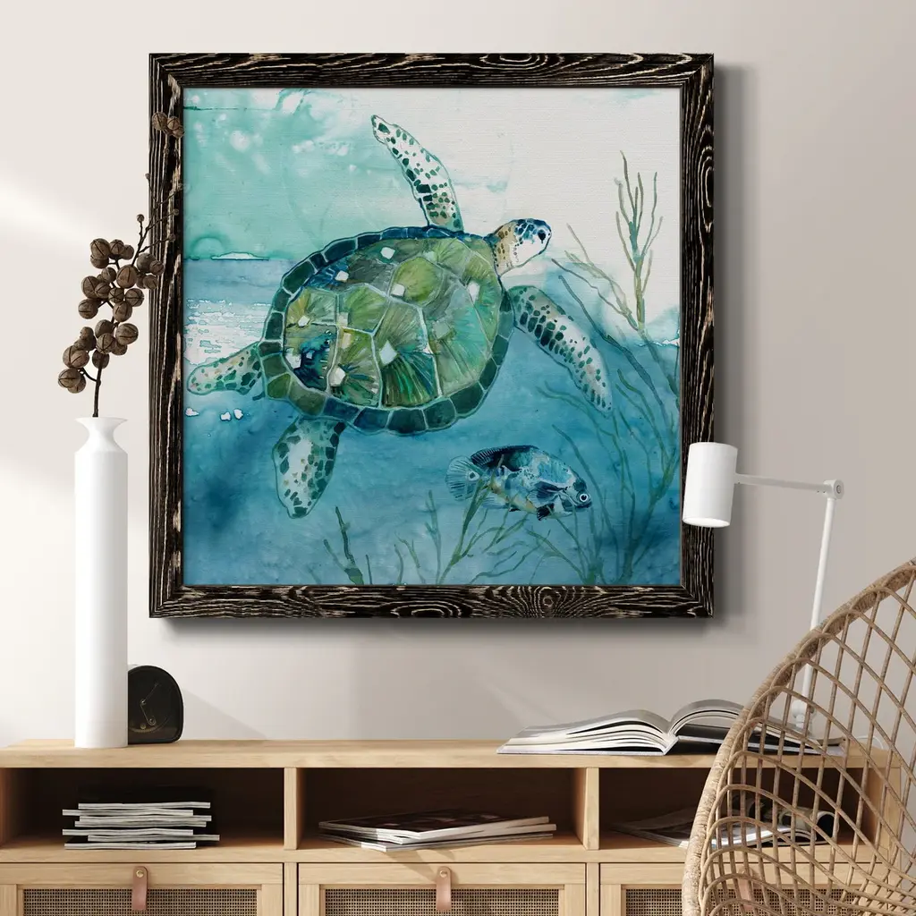 Delray Sea Turtle I-Premium Framed Canvas - Ready to Hang Framed in distressed wood and available in an array of sizes and colors Each piece is joined and assembled by hand and comes ready to hang 2 INCH BEVELED MATTE BOARD PLEXIGLASS COVERING READY TO HANG MADE IN THE USA SOLID WOOD FRAME MADE IN USA FADE RESISTANT GICLEE PRINTING on Canvas or Paper