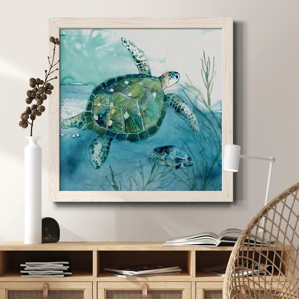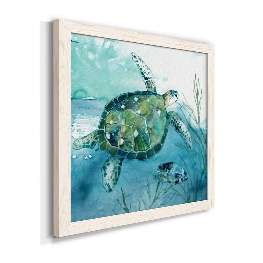 Delray Sea Turtle I-Premium Framed Canvas - Ready to Hang Framed in distressed wood and available in an array of sizes and colors Each piece is joined and assembled by hand and comes ready to hang 2 INCH BEVELED MATTE BOARD PLEXIGLASS COVERING READY TO HANG MADE IN THE USA SOLID WOOD FRAME MADE IN USA FADE RESISTANT GICLEE PRINTING on Canvas or Paper