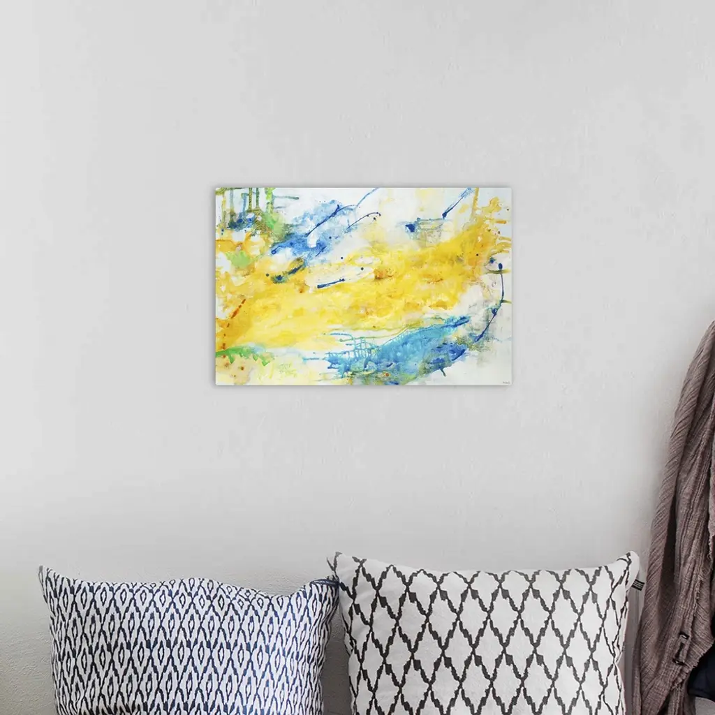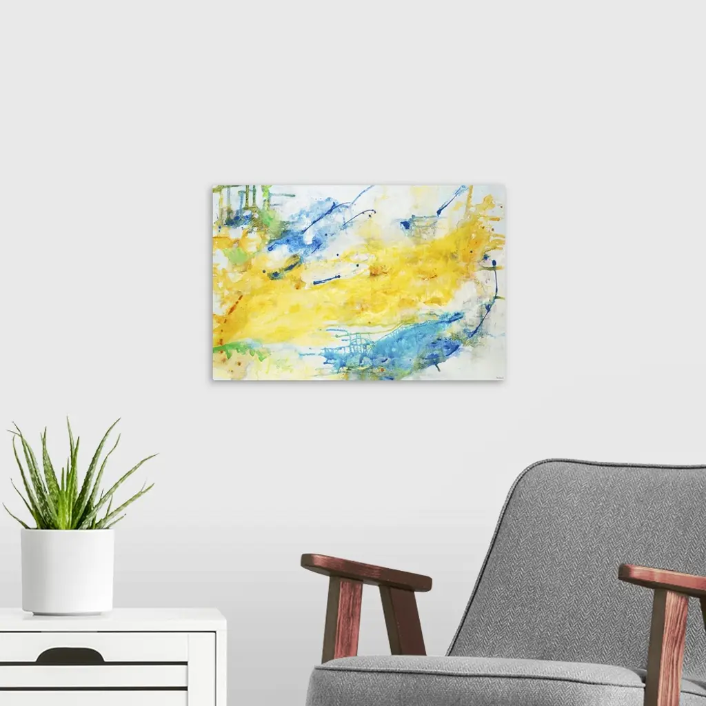A contemporary abstract painting using predominantly yellow with splashes of blue.