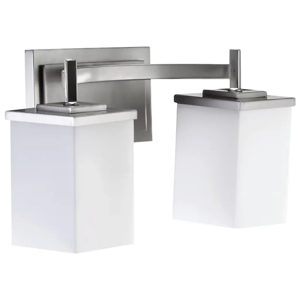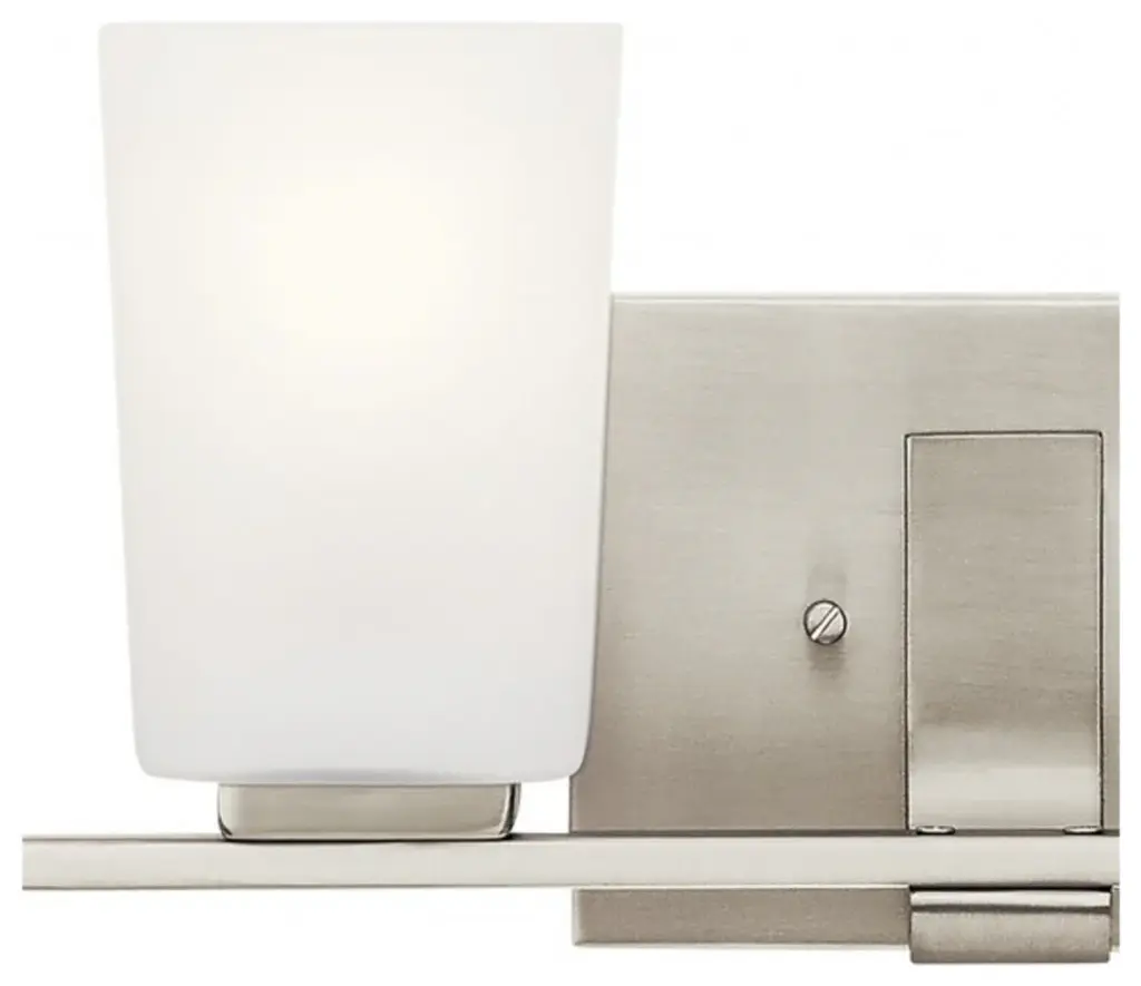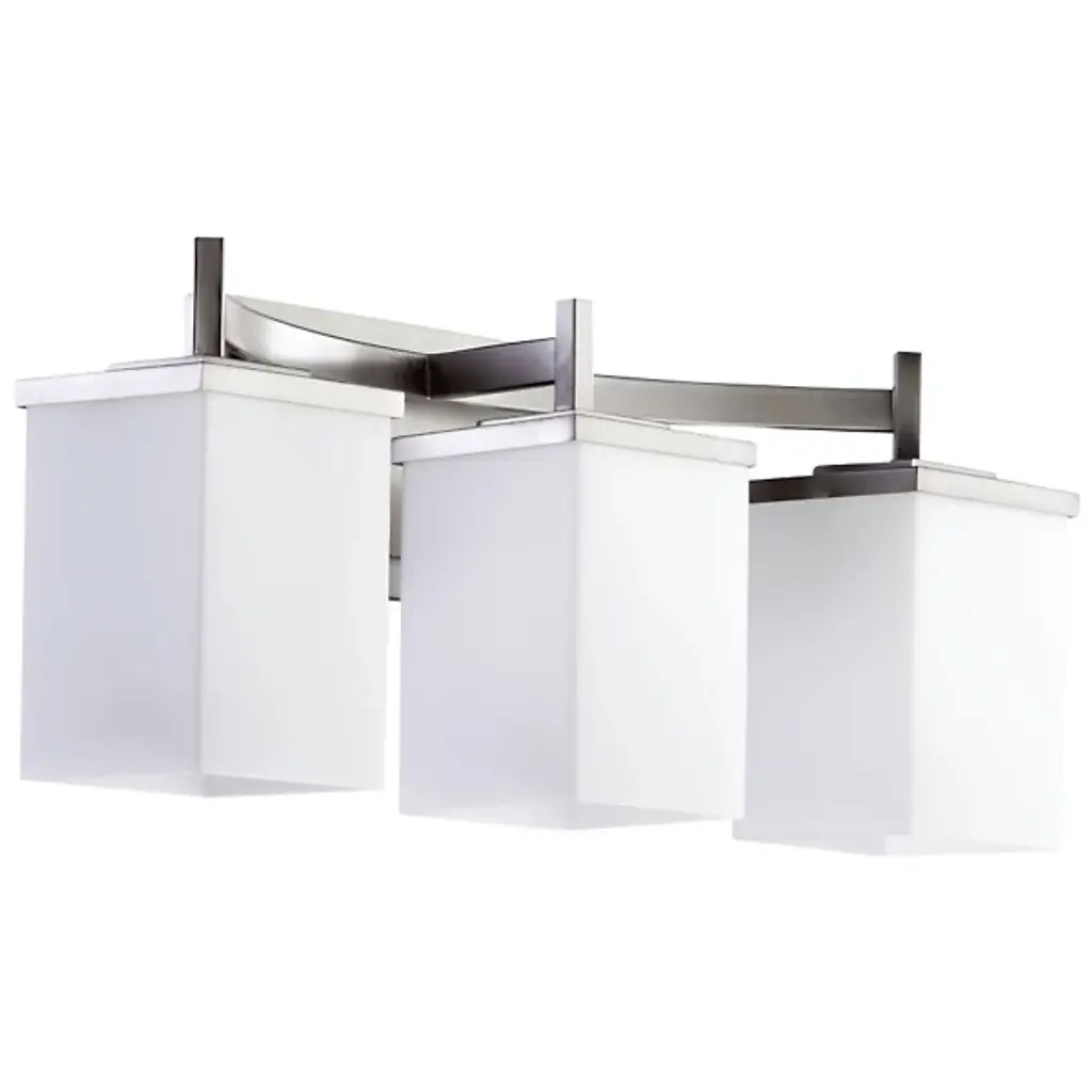 Flattering style and light for any transitional bathroom or vanity area. The Quorum Delta Vanity Light comes rectangular Satin Opal glass shades arranged along a bar curving off of the rectangular wall plate. The Delta Vanity Light can be installed either as uplights or downlights as desired.