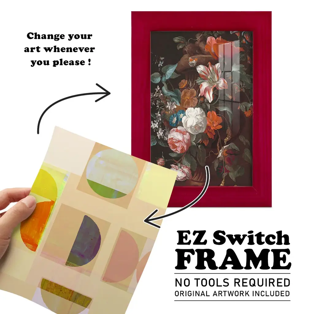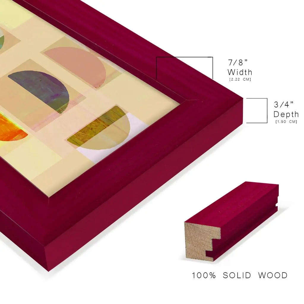 Demi I -EZ SWITCH Framed Print w/glass-Cherry Red A delightful, framed print. Featuring a solid wood frame with real wood glass. This premium print is giclee quality. In addition, every frame features a removable back and table top stand. This allows you to change your art in the future or to just stand the art on a table for a new look. We are sure you'll enjoy our new series of EZ SWITCH Framed Art. Solid Wood Frame Real Glass Removable / Replaceable Art Built in Tabletop Stand Sizes range from 4x6 up to 12x15 - buy just one or pair them up as sets as you see fit.