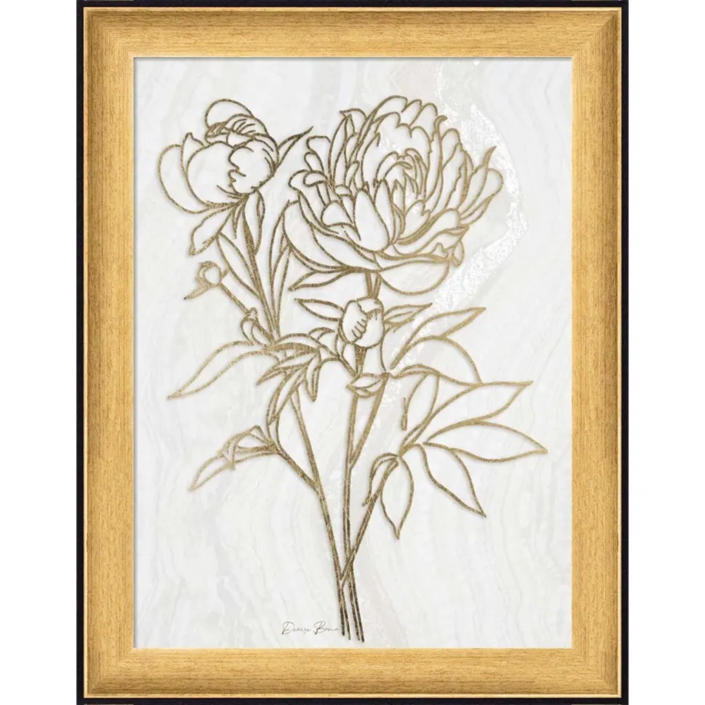 Golden Peony 2 by Denise Brown is a high quality piece of framed artwork. The finished size of this piece is 14.5" X 18.5". It has a Gold Black Accent Contemporary frame and is finished with high quality Acrylic Plexiglass. 100% Satisfaction Guaranteed.