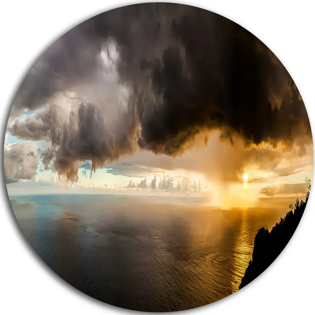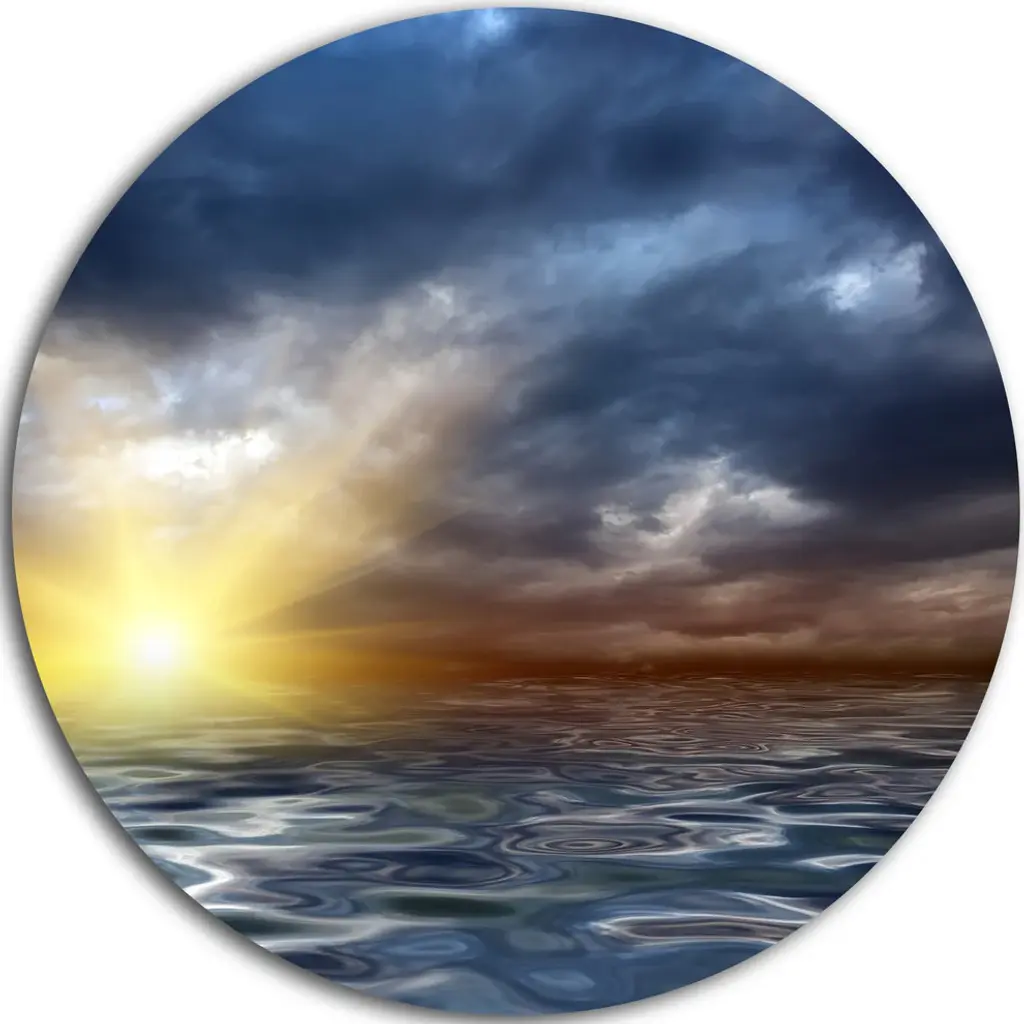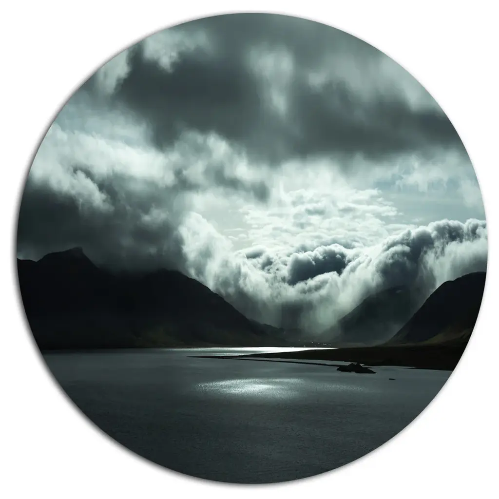 Bring Contemporary Abstraction to your home with this large Circle Metal wall art. This Dense Blue Clouds Over Lake Metal Artwork makes it the focal point of any room or office. - White Gloss Coating ensures colors are extra vibrant with light reflection.- Aluminum grade Sheet Metal with 1 inch mounting frame on the back giving the illusion that the artwork is floating on the wall..- Mounting Brackets are included along with instructions.- High Quality Digital images are created directly into a glossy aluminum panel producing a stunning and captivating print into the glossy finish of the metal.- Water, Fire and Scratch resistant HD Aluminum panels.- Looks better than any photo paper and guaranteed to last at least 20 years- Easy to clean with a microfiber cloth. Colors are far superior to regular Canvas Art. - Easy to Hang