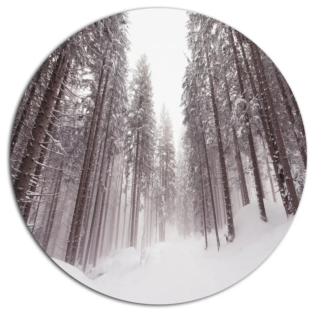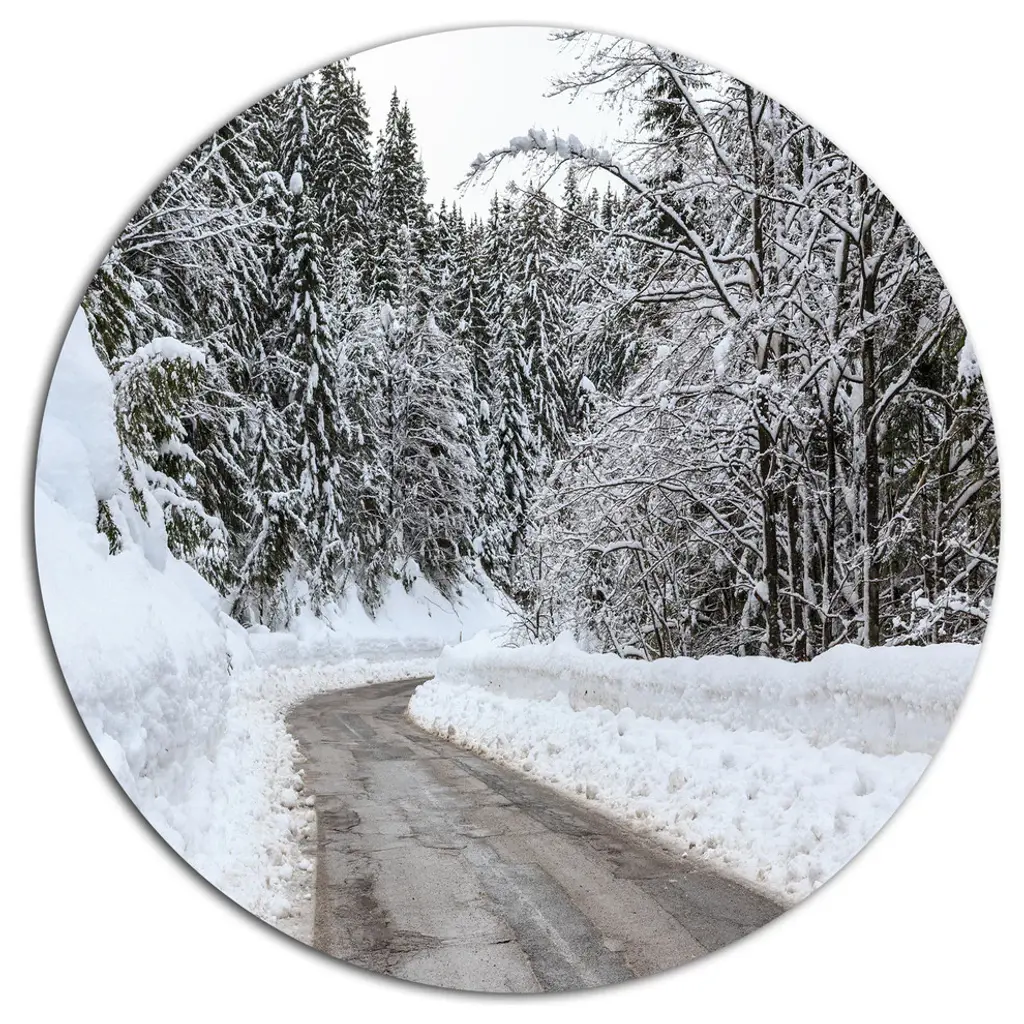 Bring Contemporary Abstraction to your home with this large Circle Metal wall art. This Dense Winter Forest and Lane Metal Artwork makes it the focal point of any room or office. - White Gloss Coating ensures colors are extra vibrant with light reflection.- Aluminum grade Sheet Metal with 1 inch mounting frame on the back giving the illusion that the artwork is floating on the wall..- Mounting Brackets are included along with instructions.- High Quality Digital images are created directly into a glossy aluminum panel producing a stunning and captivating print into the glossy finish of the metal.- Water, Fire and Scratch resistant HD Aluminum panels.- Looks better than any photo paper and guaranteed to last at least 20 years- Easy to clean with a microfiber cloth. Colors are far superior to regular Canvas Art. - Easy to Hang