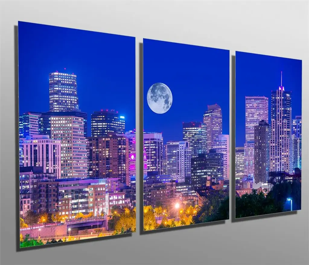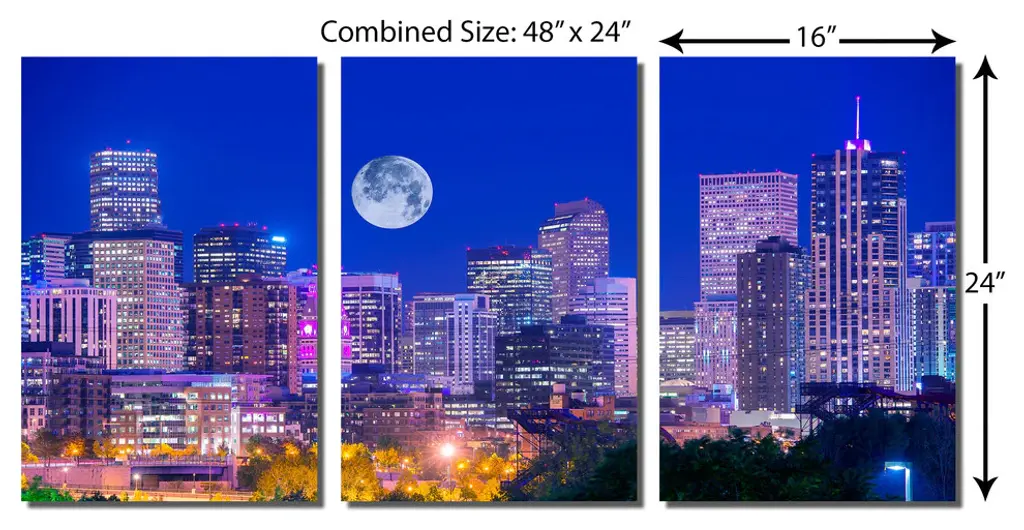 48"œ x 24"œ total size. Ready To Hang! (3 pieces - 16"œ x 24"œ each). 3 Panel Split (Triptych) Metal Print of Denver, Colorado Skyline. Modern metal wall art for home or office wall decor & interior design. Printed on Luxurious, HD aluminum glossy metal panels. Multi panel art.. HD aluminum panels. Metal print wall art. Includes Shadow Wall Mount on the back.• Aluminum Metal Wall Art• Made in USA• Ready to hang - No assembly required• Shadow mount hardware on the back• 0.045"œ thick HD Aluminum Panels• Scratch resistant, glossy finish• Superb color clarity, luxurious prints• Epson printing process• For indoor or moisture rich environment use• Easy to clean. Gently wipe with microfiber cloth.