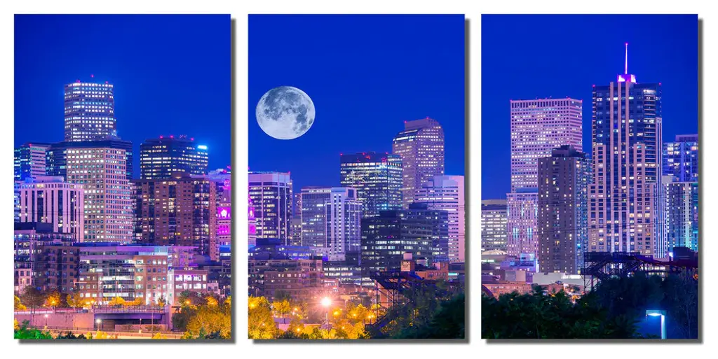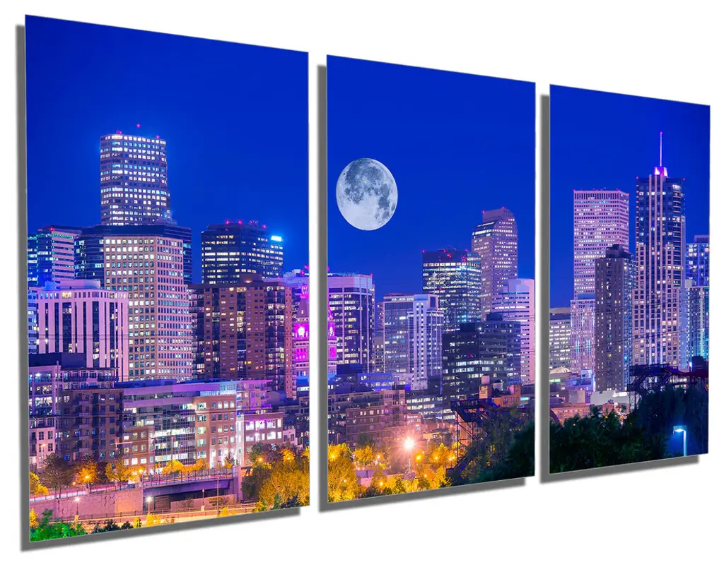 60"œ x 30"œ total size. Ready To Hang! (3 pieces - 20"œ x 30"œ each). 3 Panel Split (Triptych) Metal Print of Denver, Colorado Skyline. Modern metal wall art for home or office wall decor & interior design. Printed on Luxurious, HD aluminum glossy metal panels. Multi panel art.. HD aluminum panels. Metal print wall art. Includes Shadow Wall Mount on the back.• Aluminum Metal Wall Art• Made in USA• Ready to hang - No assembly required• Shadow mount hardware on the back• 0.045"œ thick HD Aluminum Panels• Scratch resistant, glossy finish• Superb color clarity, luxurious prints• Epson printing process• For indoor or moisture rich environment use• Easy to clean. Gently wipe with microfiber cloth.