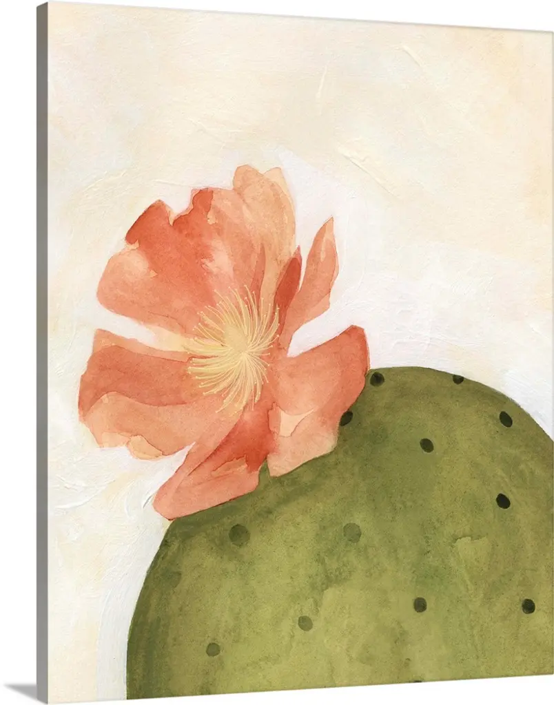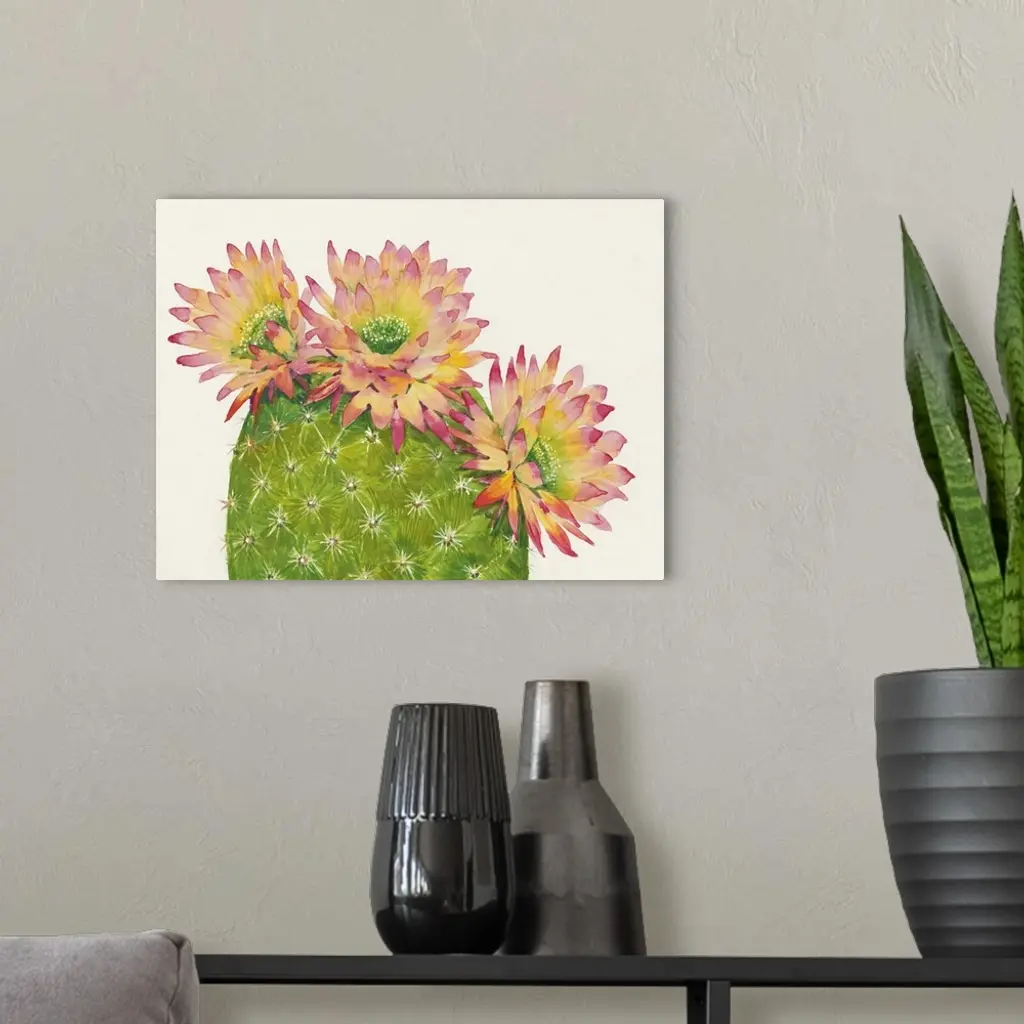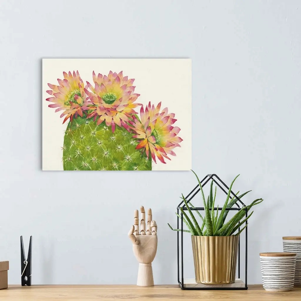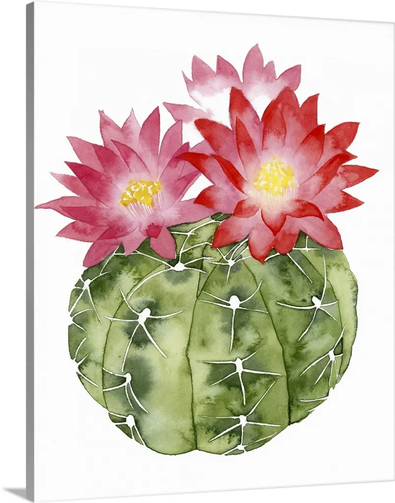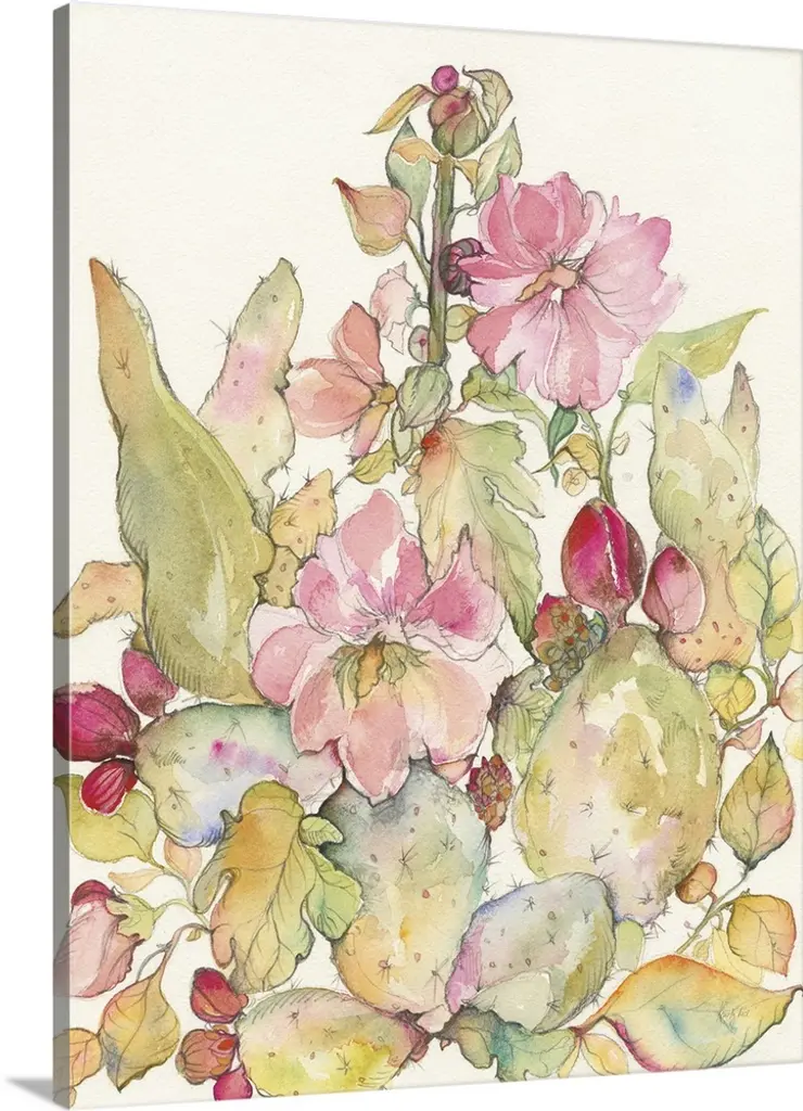 A contemporary watercolor painting of a cactus with colorful flowers.