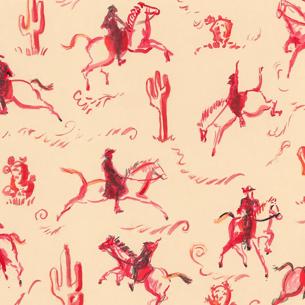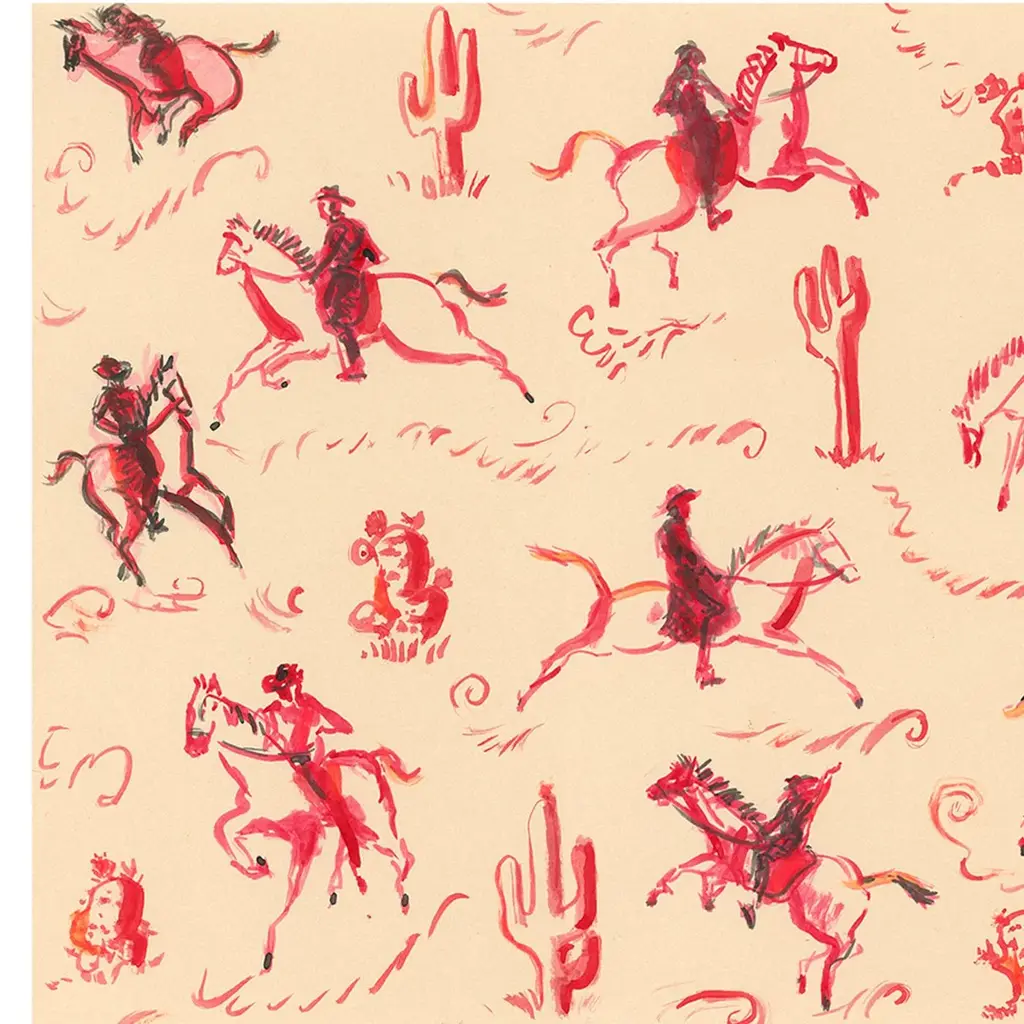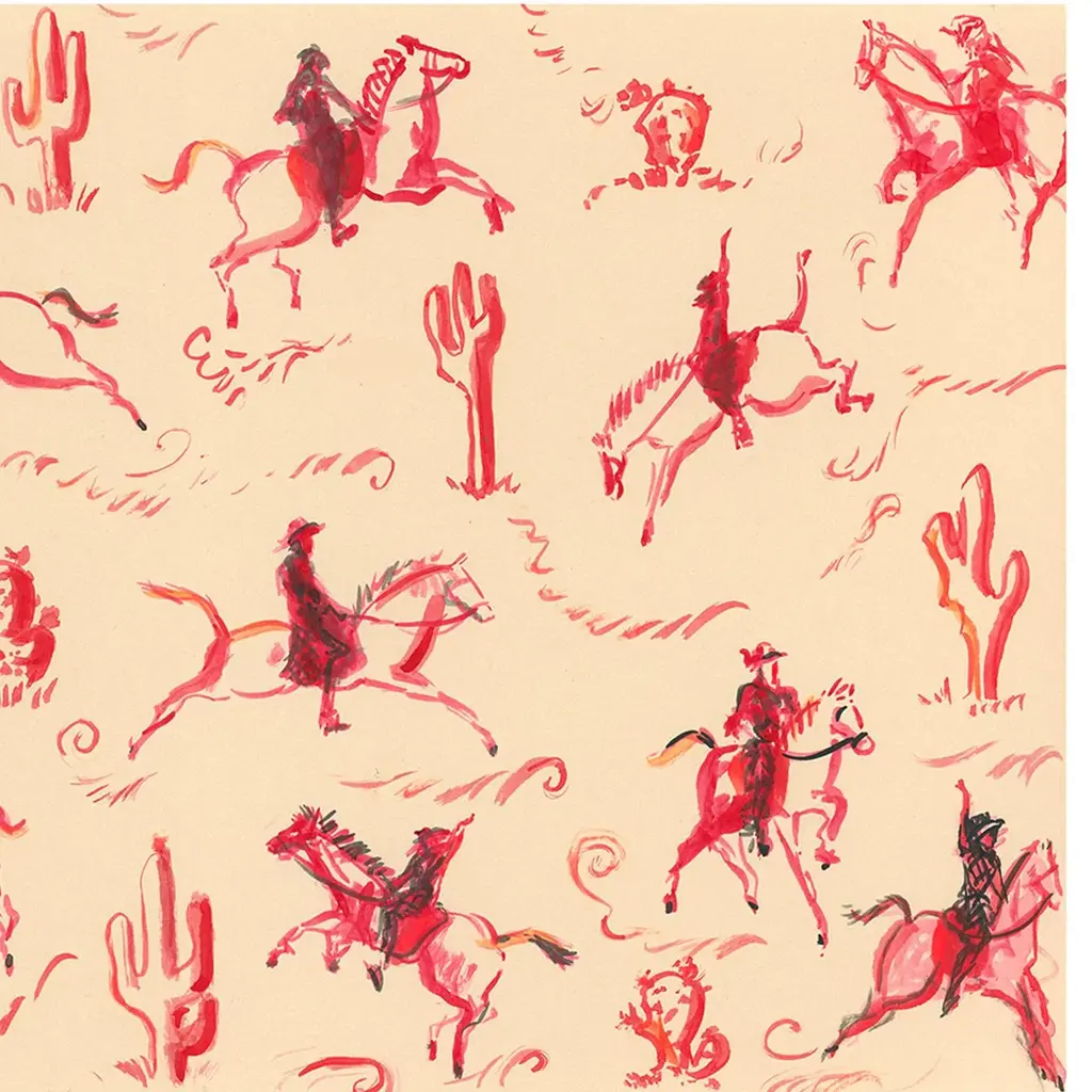 Cowboys and their horses dash through the desert all created using a red color palette.