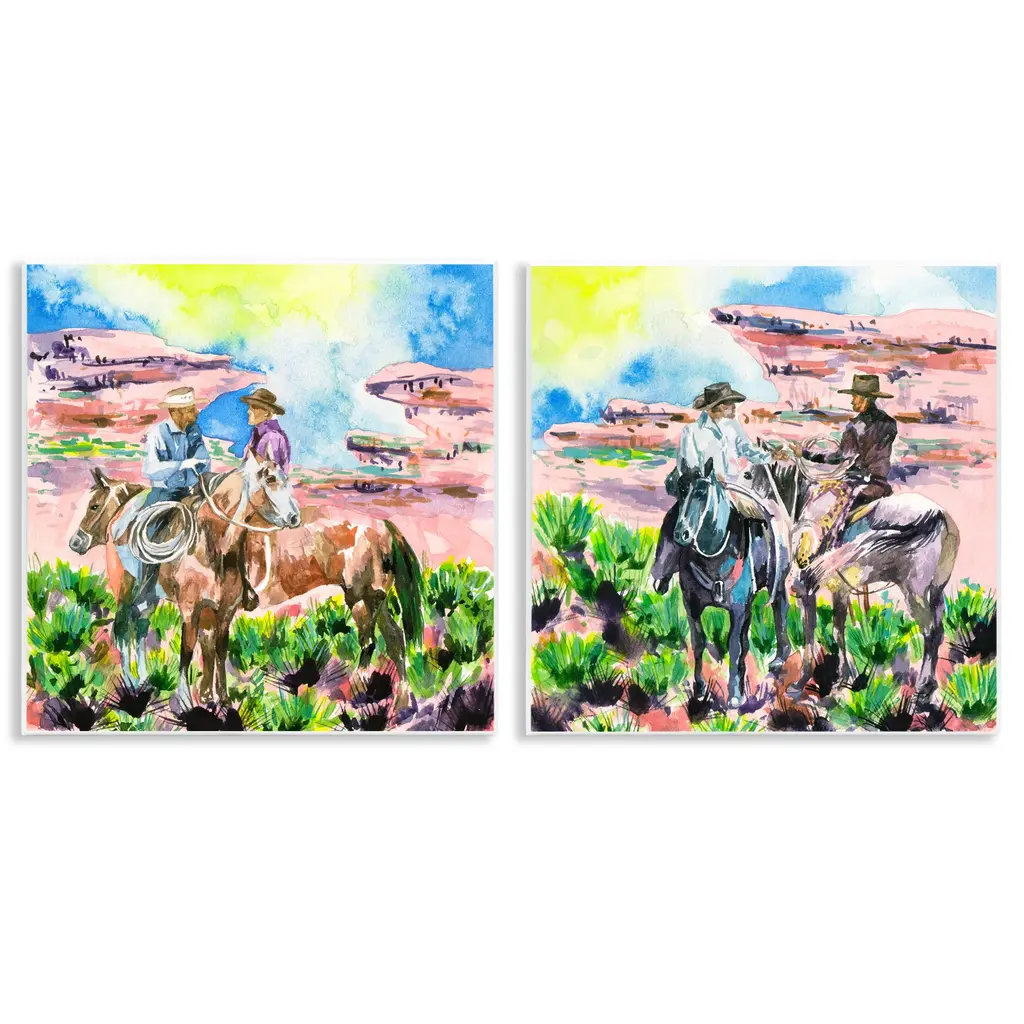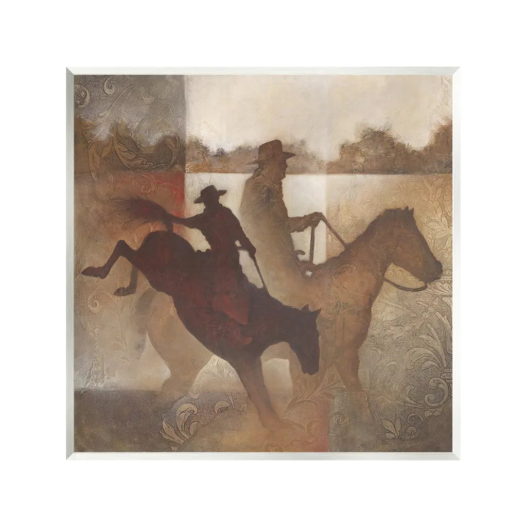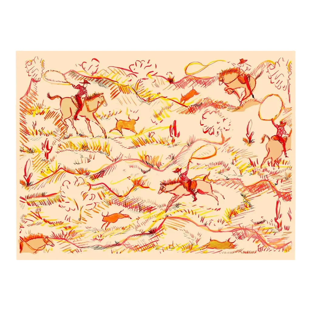 Cowboys and their horses dash through the desert all created using a red color palette.