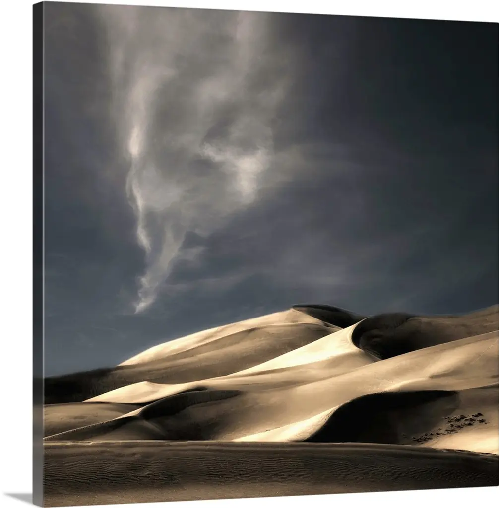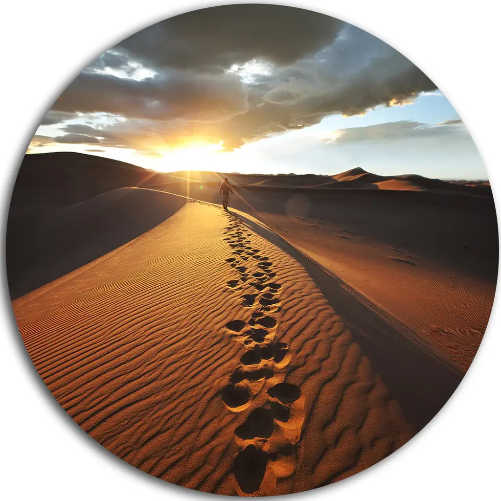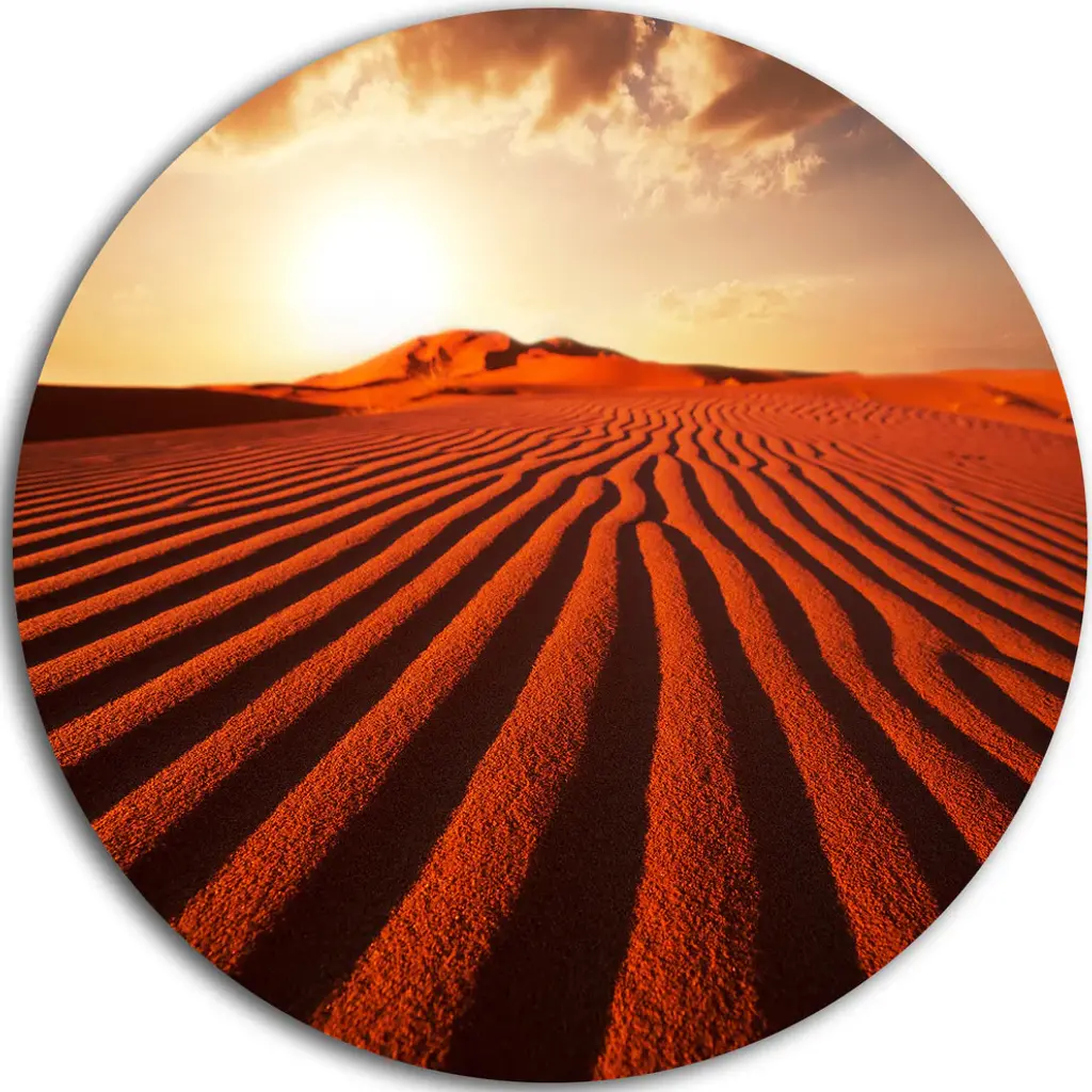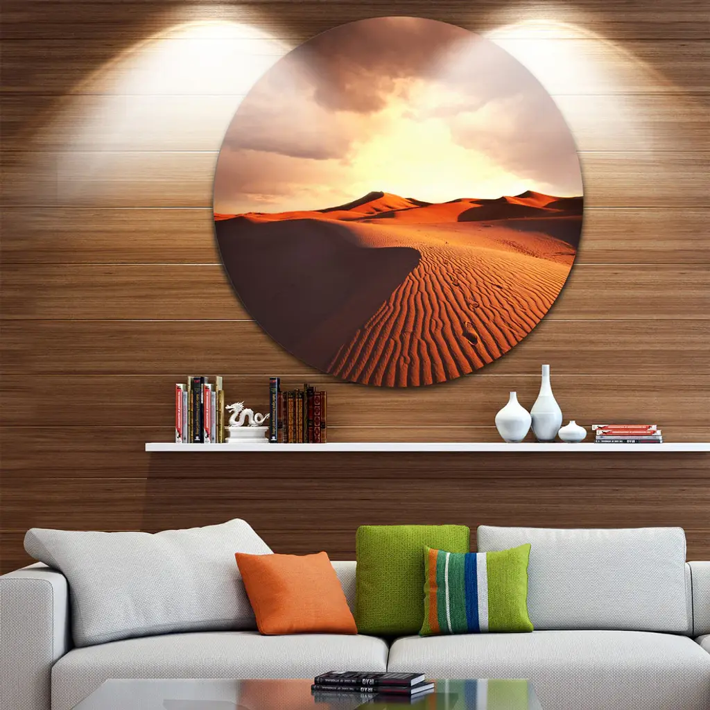 Bring Contemporary Abstraction to your home with this large Circle Metal wall art. This Desert Dunes under Cloudy Sky Metal Artwork makes it the focal point of any room or office. - White Gloss Coating ensures colors are extra vibrant with light reflection.- Aluminum grade Sheet Metal with 1 inch mounting frame on the back giving the illusion that the artwork is floating on the wall..- Mounting Brackets are included along with instructions.- High Quality Digital images are created directly into a glossy aluminum panel producing a stunning and captivating print into the glossy finish of the metal.- Water, Fire and Scratch resistant HD Aluminum panels.- Looks better than any photo paper and guaranteed to last at least 20 years- Easy to clean with a microfiber cloth. Colors are far superior to regular Canvas Art. - Easy to Hang