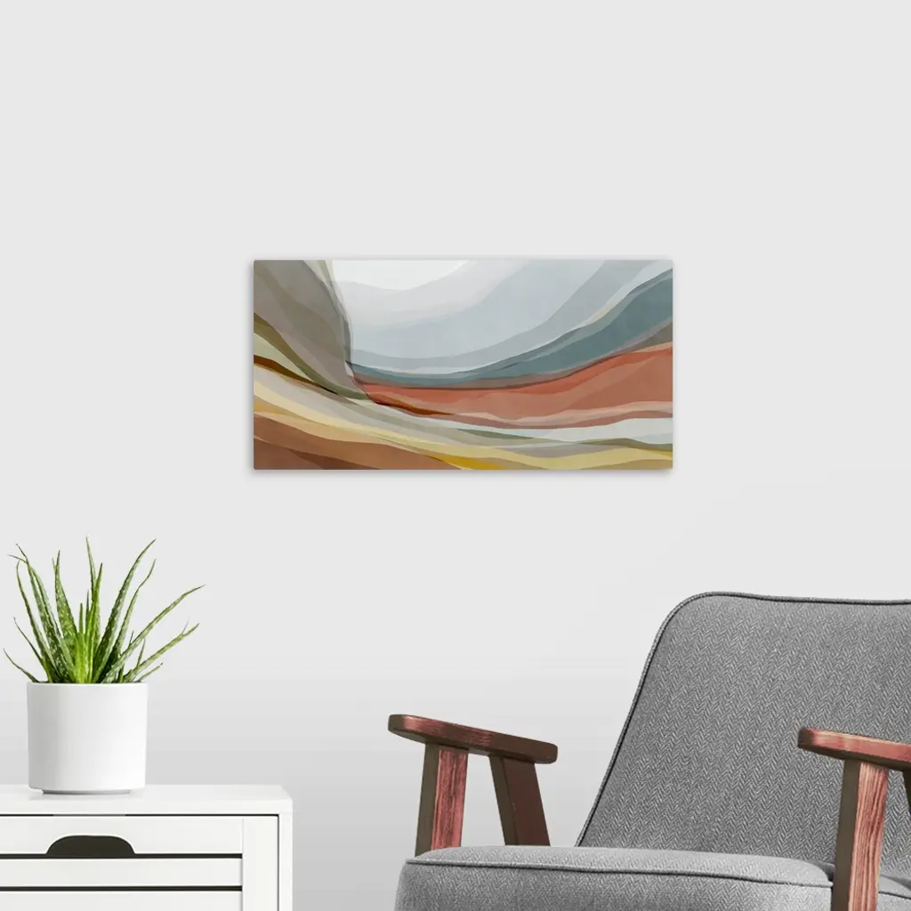 An organic, contemporary abstract art piece with curving layers of overlapping muted colors that look like rock strata under a light blue sky