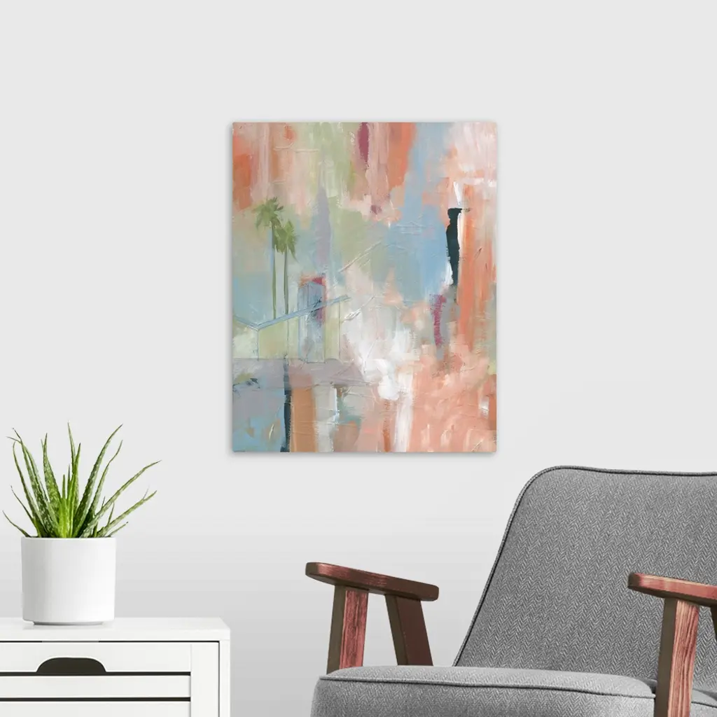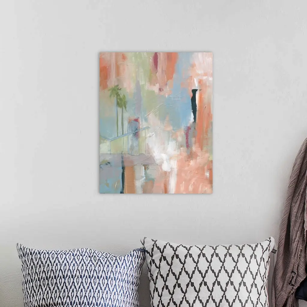 Contemporary abstract painting in shades of orange and blue, with subtle palm tree shapes.