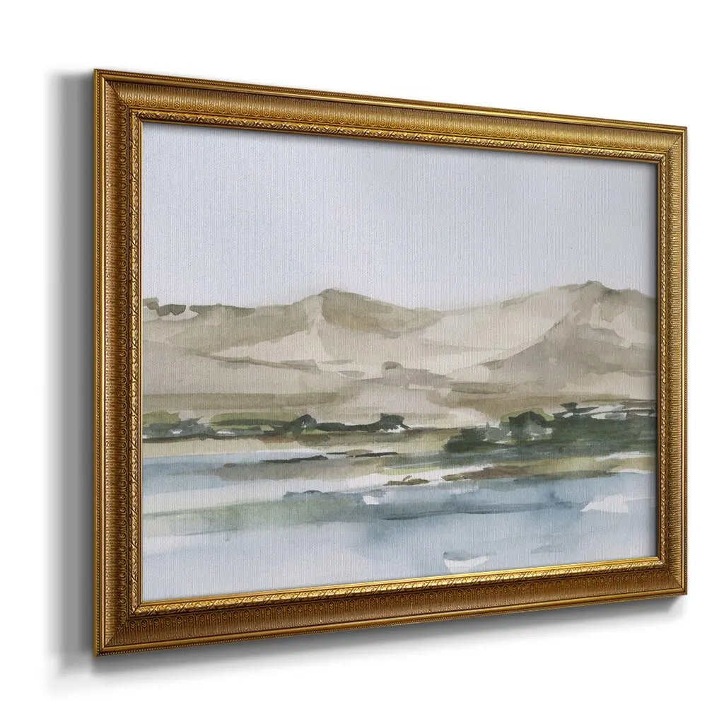 Desert Mountains II Premium Framed Canvas- Ready to Hang A Premium Framed Canvas created to last. Framed in distressed wood and available in an array of sizes and colors Featuring a beveled a solid wood stretcher bar, each piece comes ready to hand 3 SIZES AVAILABLE 16''X20'' - Overall Size 18'X27'' - Overall Size 24''x36'' - Overall Size Each piece is made to order. Each piece comes with hanging hardware. Made in the USA Ready to Hang Giclee Paper Print Acrylic Glass Beveled Matt Board