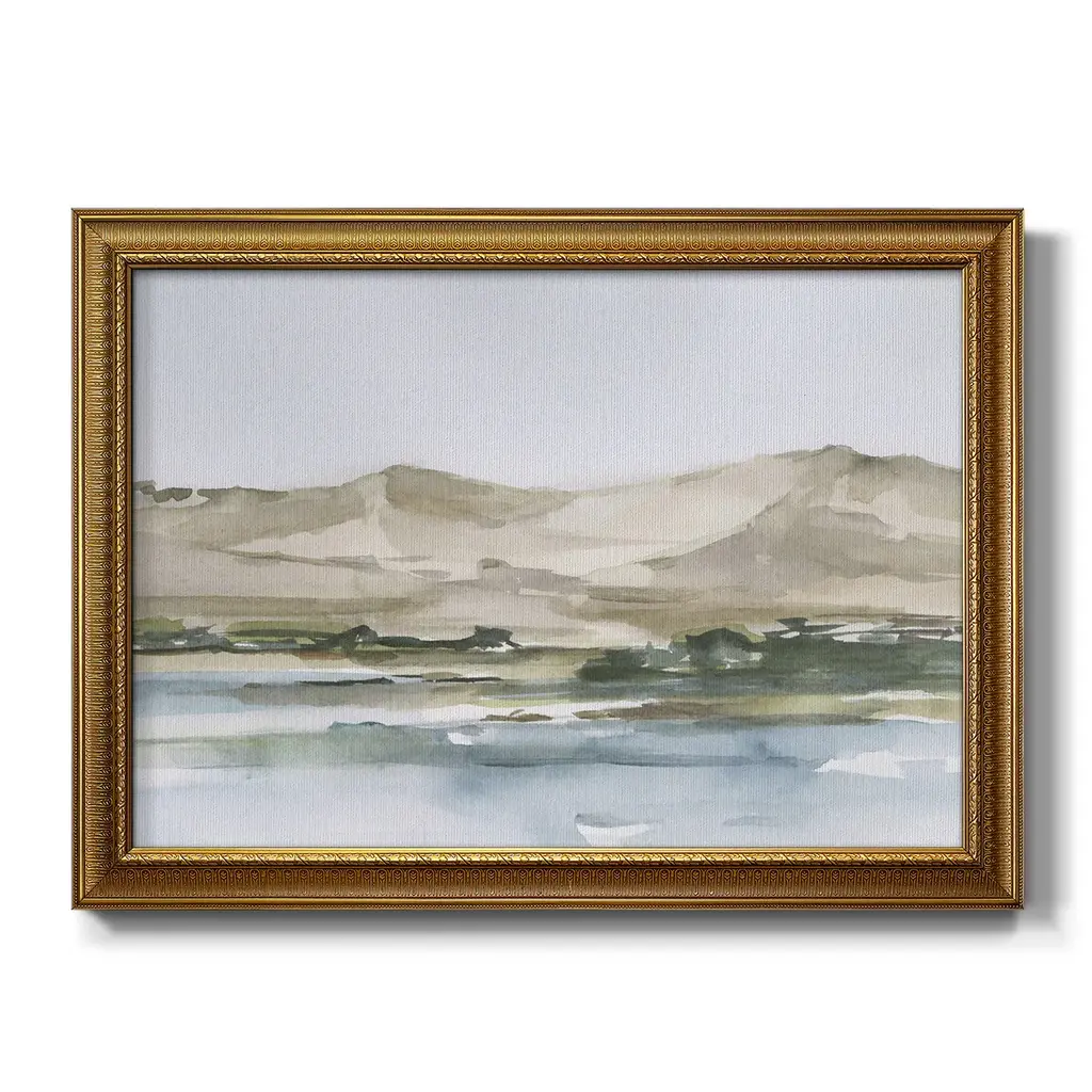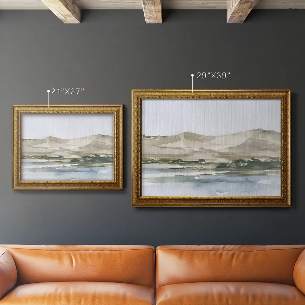 Desert Mountains II Premium Framed Canvas- Ready to Hang A Premium Framed Canvas created to last. Framed in distressed wood and available in an array of sizes and colors Featuring a beveled a solid wood stretcher bar, each piece comes ready to hand 3 SIZES AVAILABLE 16''X20'' - Overall Size 18'X27'' - Overall Size 24''x36'' - Overall Size Each piece is made to order. Each piece comes with hanging hardware. Made in the USA Ready to Hang Giclee Paper Print Acrylic Glass Beveled Matt Board