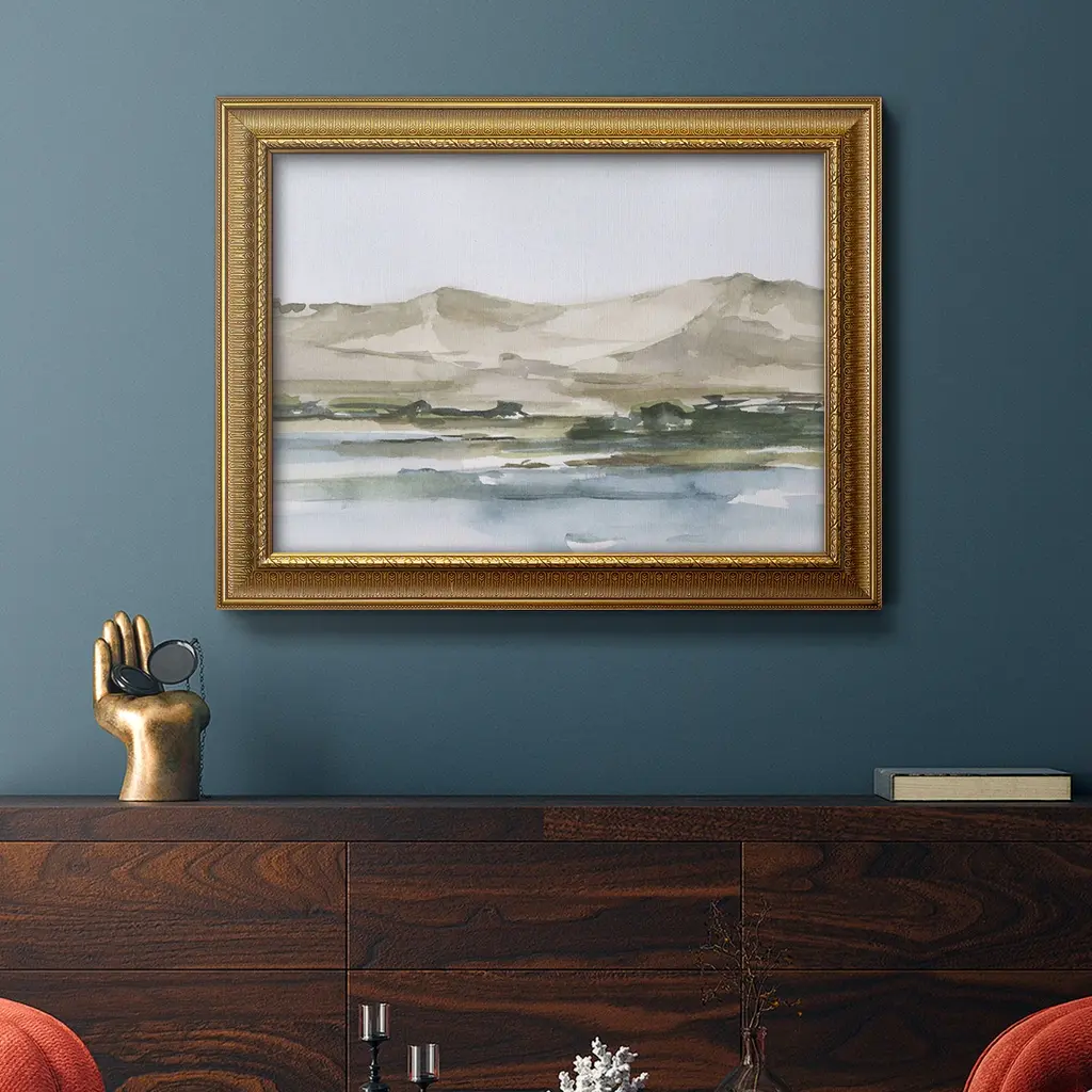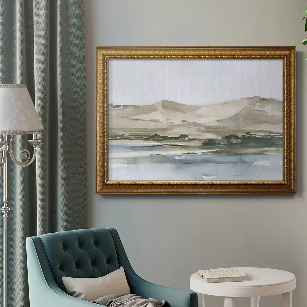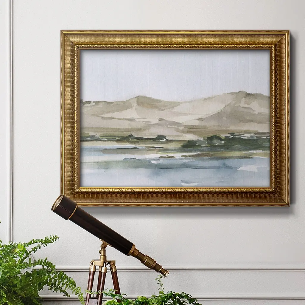 Desert Mountains II Premium Framed Canvas- Ready to Hang A Premium Framed Canvas created to last. Framed in distressed wood and available in an array of sizes and colors Featuring a beveled a solid wood stretcher bar, each piece comes ready to hand 3 SIZES AVAILABLE 16''X20'' - Overall Size 18'X27'' - Overall Size 24''x36'' - Overall Size Each piece is made to order. Each piece comes with hanging hardware. Made in the USA Ready to Hang Giclee Paper Print Acrylic Glass Beveled Matt Board