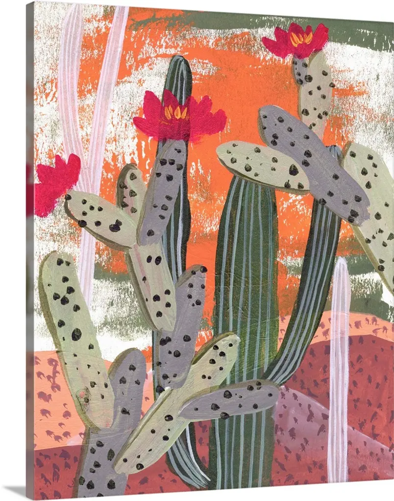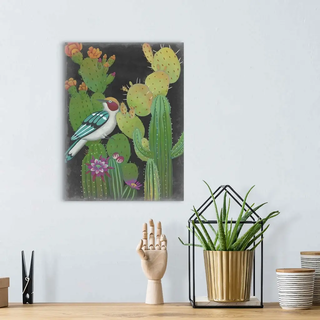Contemporary Southwestern-themed artwork of a colorful bird on a cactus.