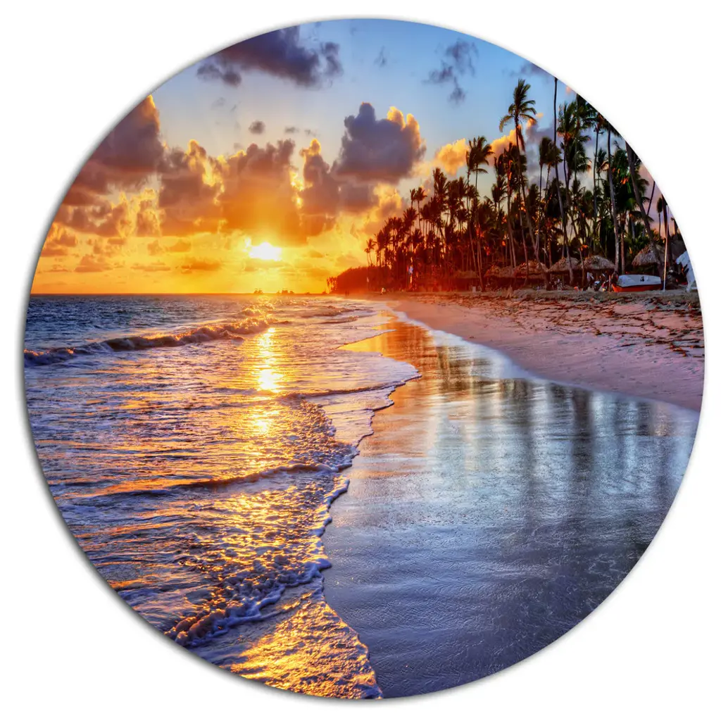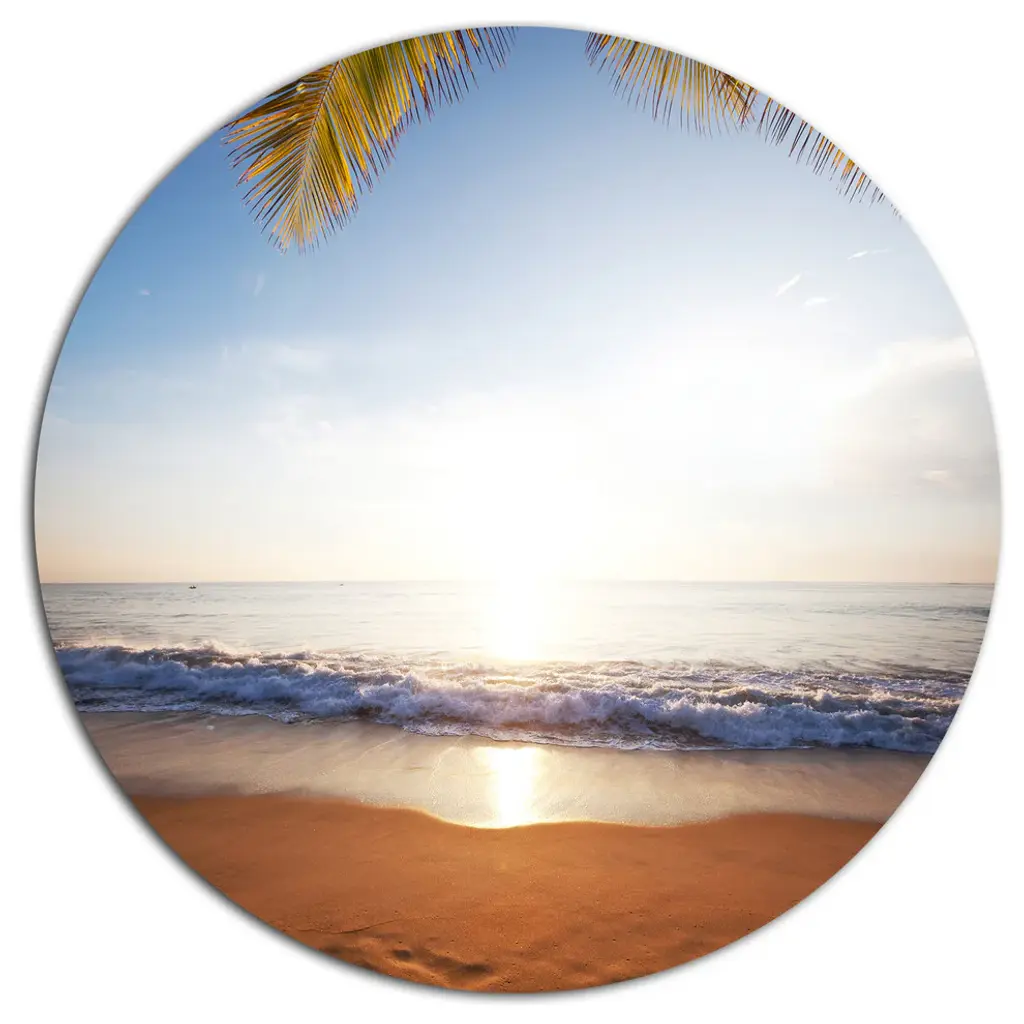 Bring Contemporary Abstraction to your home with this large Circle Metal wall art. This Deserted Beach with Palm Leaves Metal Artwork makes it the focal point of any room or office. - White Gloss Coating ensures colors are extra vibrant with light reflection.- Aluminum grade Sheet Metal with 1 inch mounting frame on the back giving the illusion that the artwork is floating on the wall..- Mounting Brackets are included along with instructions.- High Quality Digital images are created directly into a glossy aluminum panel producing a stunning and captivating print into the glossy finish of the metal.- Water, Fire and Scratch resistant HD Aluminum panels.- Looks better than any photo paper and guaranteed to last at least 20 years- Easy to clean with a microfiber cloth. Colors are far superior to regular Canvas Art. - Easy to Hang