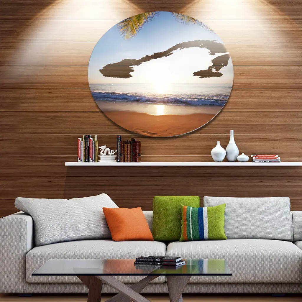 Bring Contemporary Abstraction to your home with this large Circle Metal wall art. This Deserted Beach with Palm Leaves Metal Artwork makes it the focal point of any room or office. - White Gloss Coating ensures colors are extra vibrant with light reflection.- Aluminum grade Sheet Metal with 1 inch mounting frame on the back giving the illusion that the artwork is floating on the wall..- Mounting Brackets are included along with instructions.- High Quality Digital images are created directly into a glossy aluminum panel producing a stunning and captivating print into the glossy finish of the metal.- Water, Fire and Scratch resistant HD Aluminum panels.- Looks better than any photo paper and guaranteed to last at least 20 years- Easy to clean with a microfiber cloth. Colors are far superior to regular Canvas Art. - Easy to Hang
