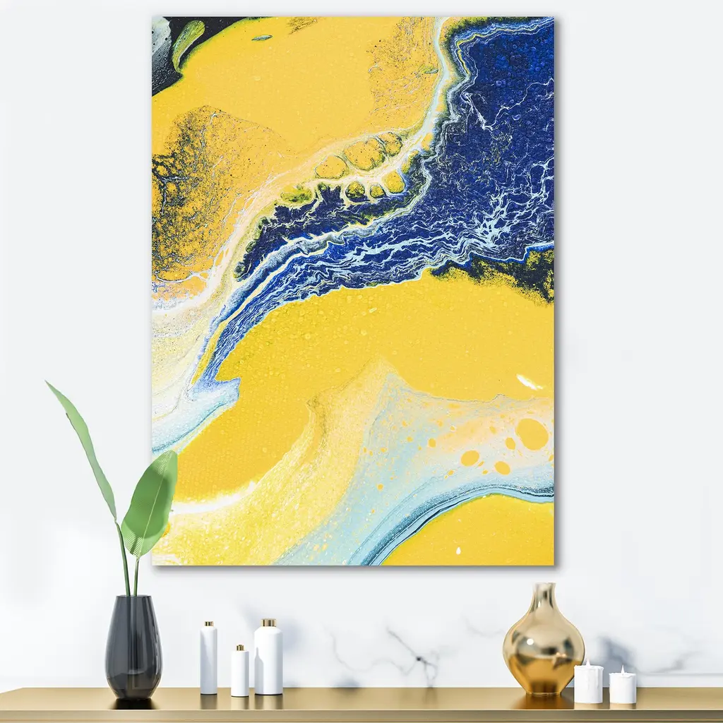 Designart "Abstract Composition In Yellow And Blue Vii" Modern Canvas Wall Art Print - 12 In. Wide X 20 In. High