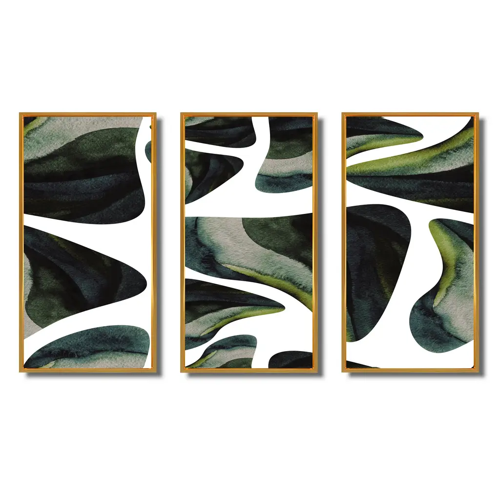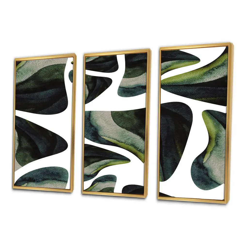 Designart "Abstract Dark Green Organic Elements Iii" Modern Framed Wall Decor Set Of 3 - 4 Colors Of Frames - 36 In. Wide X 28 In. High - 3 Panels - Gold