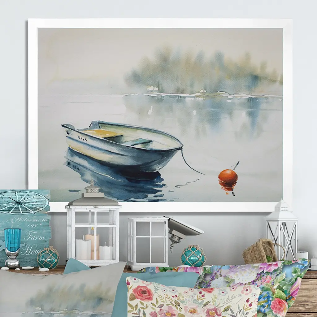 Designart "Abstract Wooden Boat In Lake" Lake House Framed Wall Decor - 12 In. Wide X 8 In. High - White