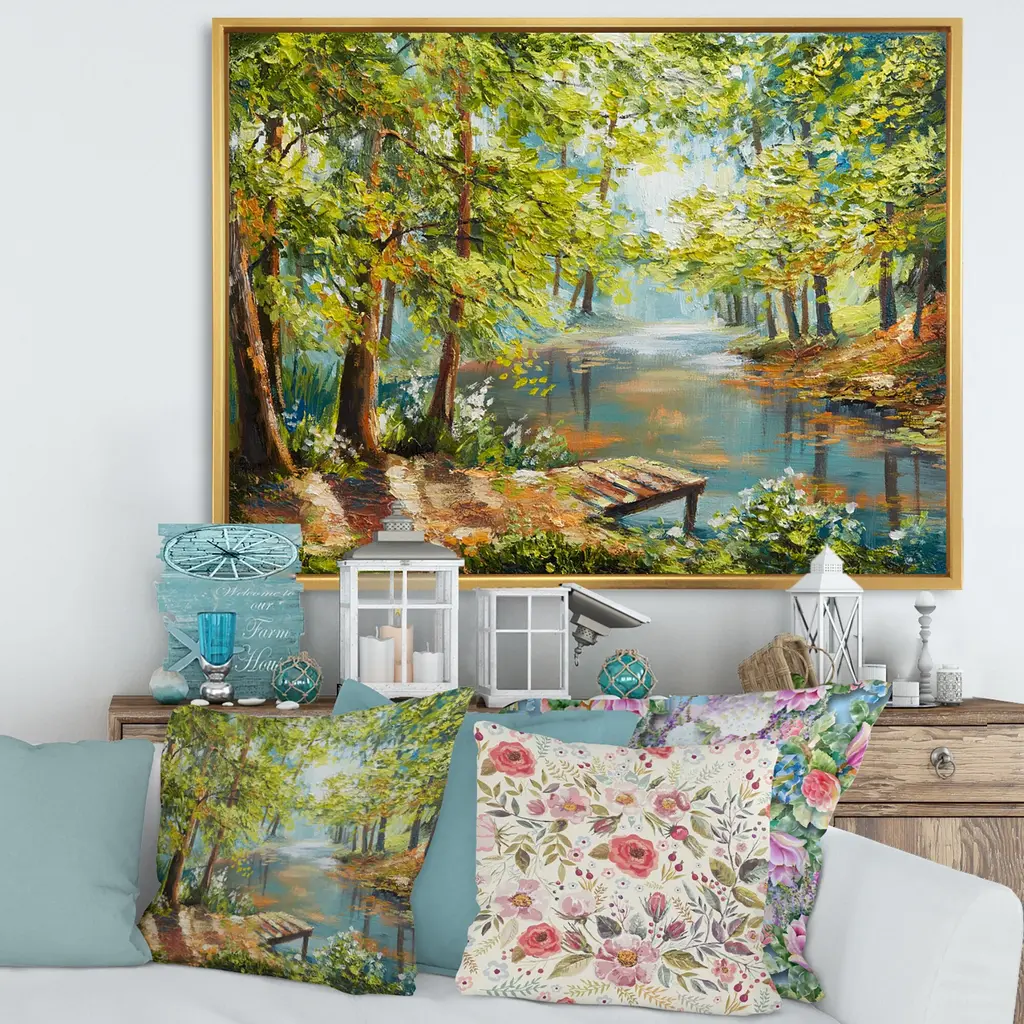 This beautiful Autumn Forest With Meandering River Framed Canvas Art is printed using the highest quality fade-resistant ink on canvas. Every one of our fine art giclee canvas prints is printed on premium quality canvas, using the finest quality inks which will not fade over time. Each giclee print is stretched tightly over a 1-inch wood sub frame ensuring the canvas is taught and does not buckle. The canvas print is inserted into a wood floating frame. All of our Framed canvas prints are carefully packaged with corner protection, fragile labeling and sturdy boxes to ensure safe delivery. Every canvas print arrives ready to hang on the wall, with the hanging kits included. Features: - Style : Lake House - Subject : Landscapes, Country Charm - Color : Green - Premium quality cotton canvas. - Arrives ready to hang on the wall - Easy to Hang