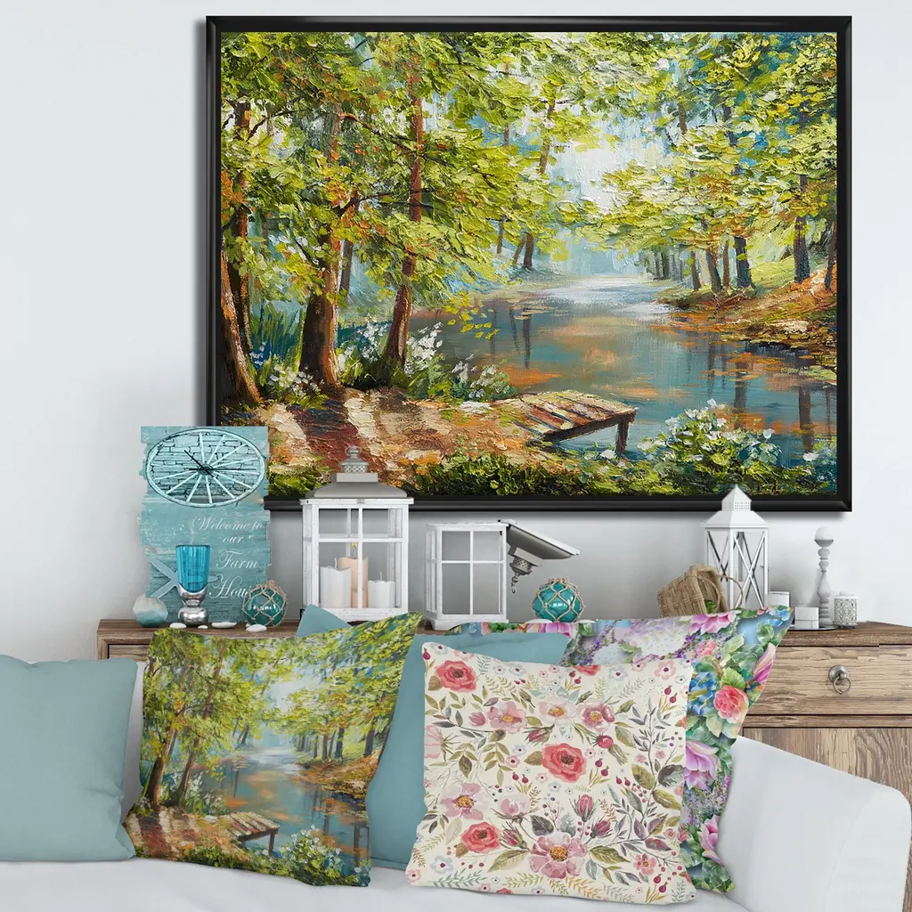 This beautiful Autumn Forest With Meandering River Framed Canvas Art is printed using the highest quality fade-resistant ink on canvas. Every one of our fine art giclee canvas prints is printed on premium quality canvas, using the finest quality inks which will not fade over time. Each giclee print is stretched tightly over a 1-inch wood sub frame ensuring the canvas is taught and does not buckle. The canvas print is inserted into a wood floating frame. All of our Framed canvas prints are carefully packaged with corner protection, fragile labeling and sturdy boxes to ensure safe delivery. Every canvas print arrives ready to hang on the wall, with the hanging kits included. Features: - Style : Lake House - Subject : Landscapes, Country Charm - Color : Green - Premium quality cotton canvas. - Arrives ready to hang on the wall - Easy to Hang