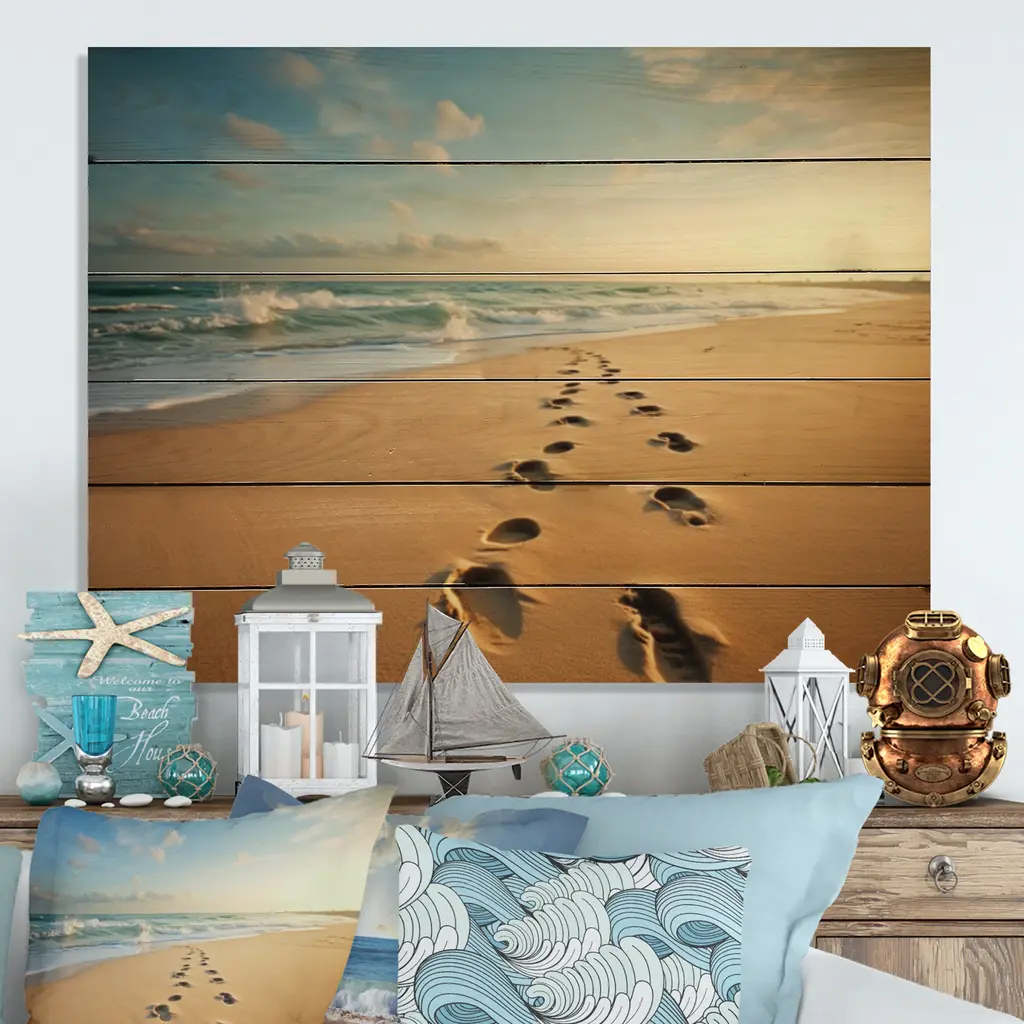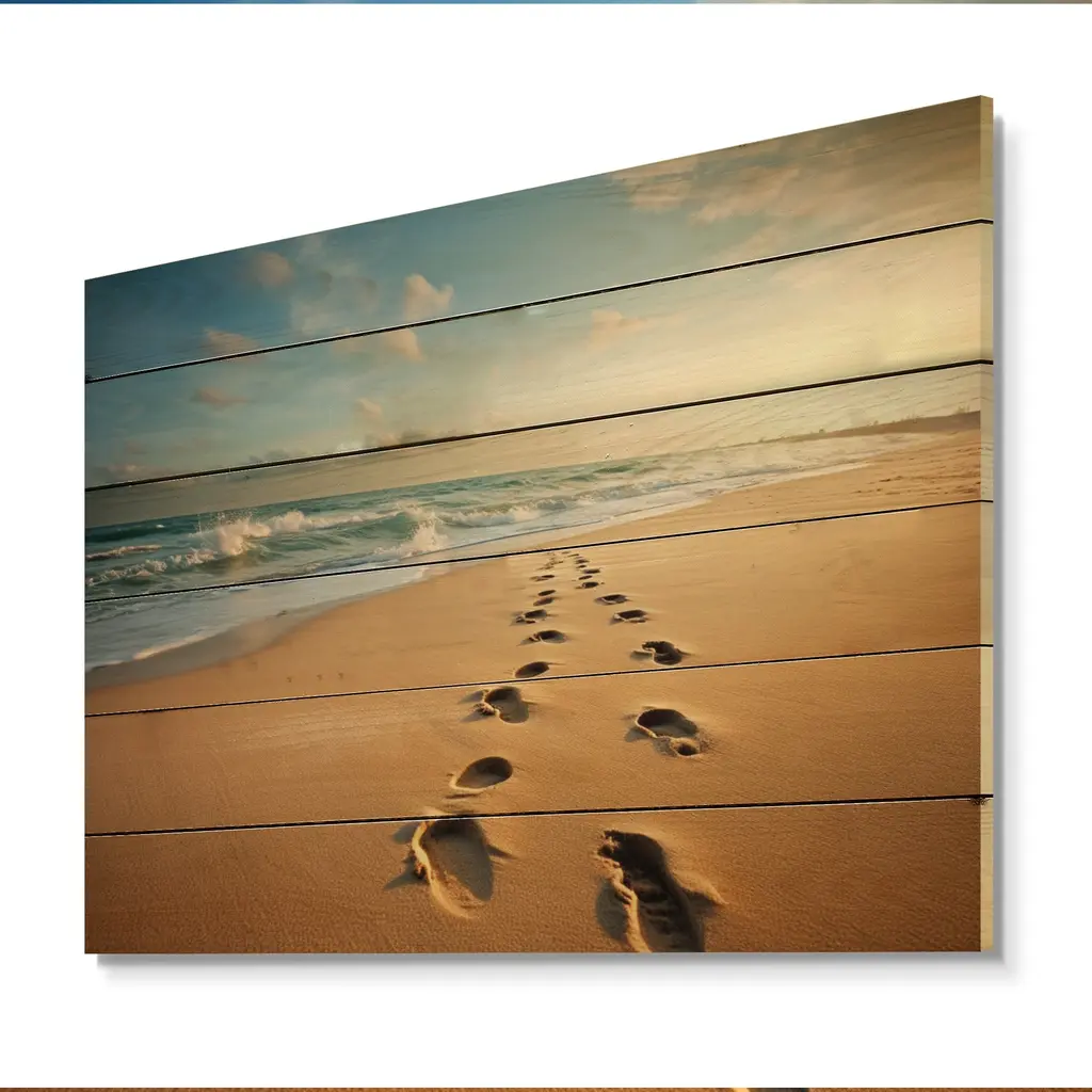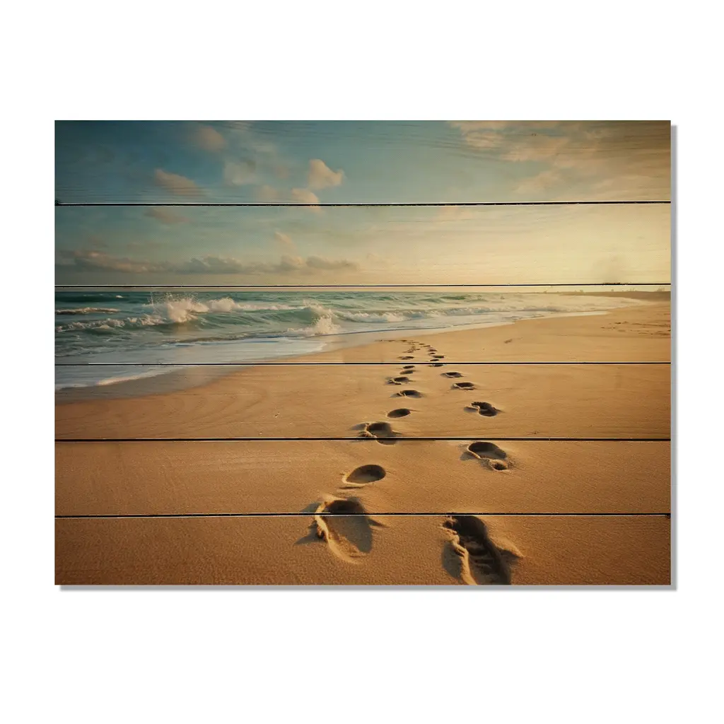 Designart "Beach Photo Footprints In V" Nautical & Beach Print On Natural Pine Wood - 40 In. Wide X 30 In. High