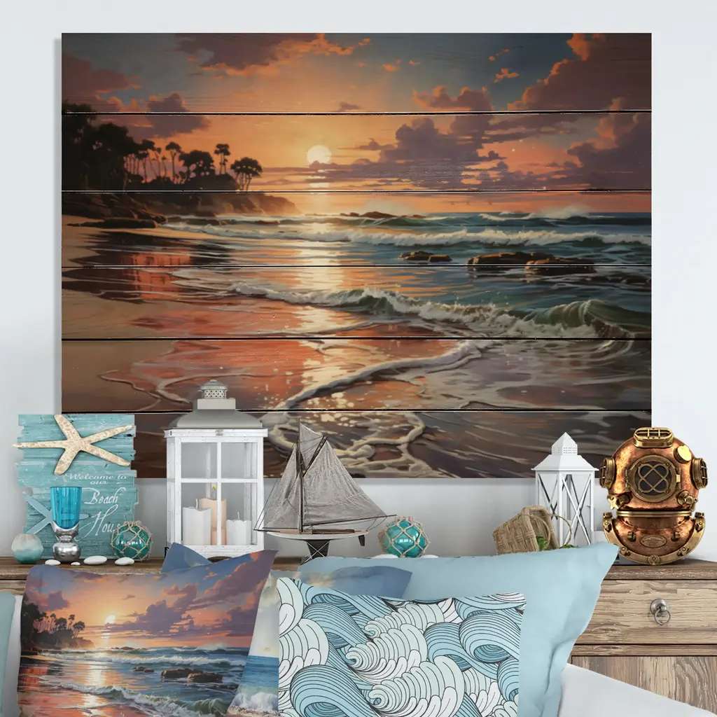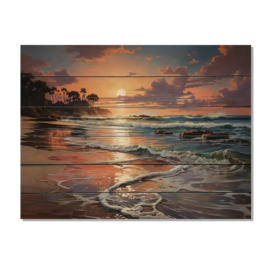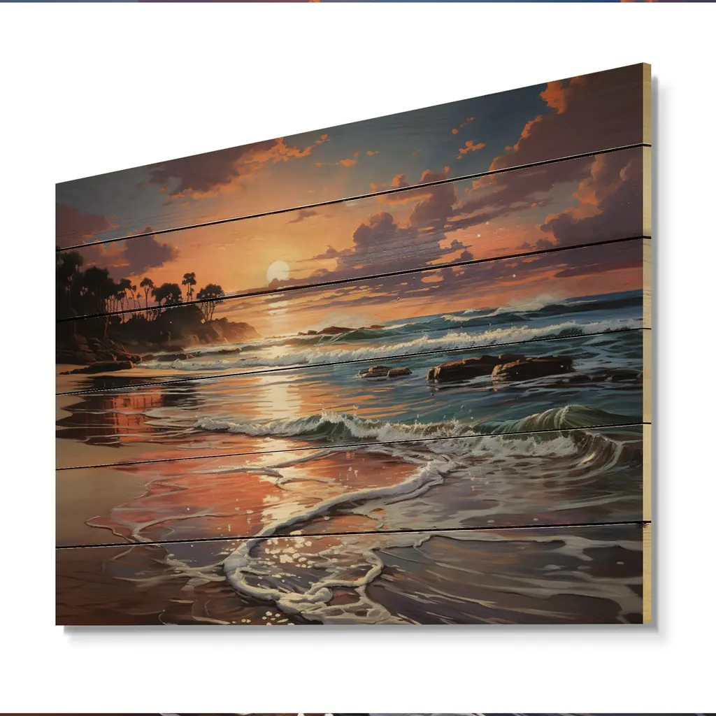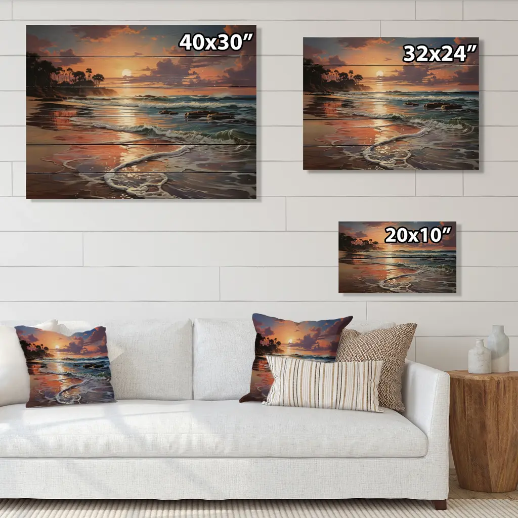 Designart "Beach Sunset Beach Ii" Nautical & Beach Print On Natural Pine Wood - 40 In. Wide X 30 In. High