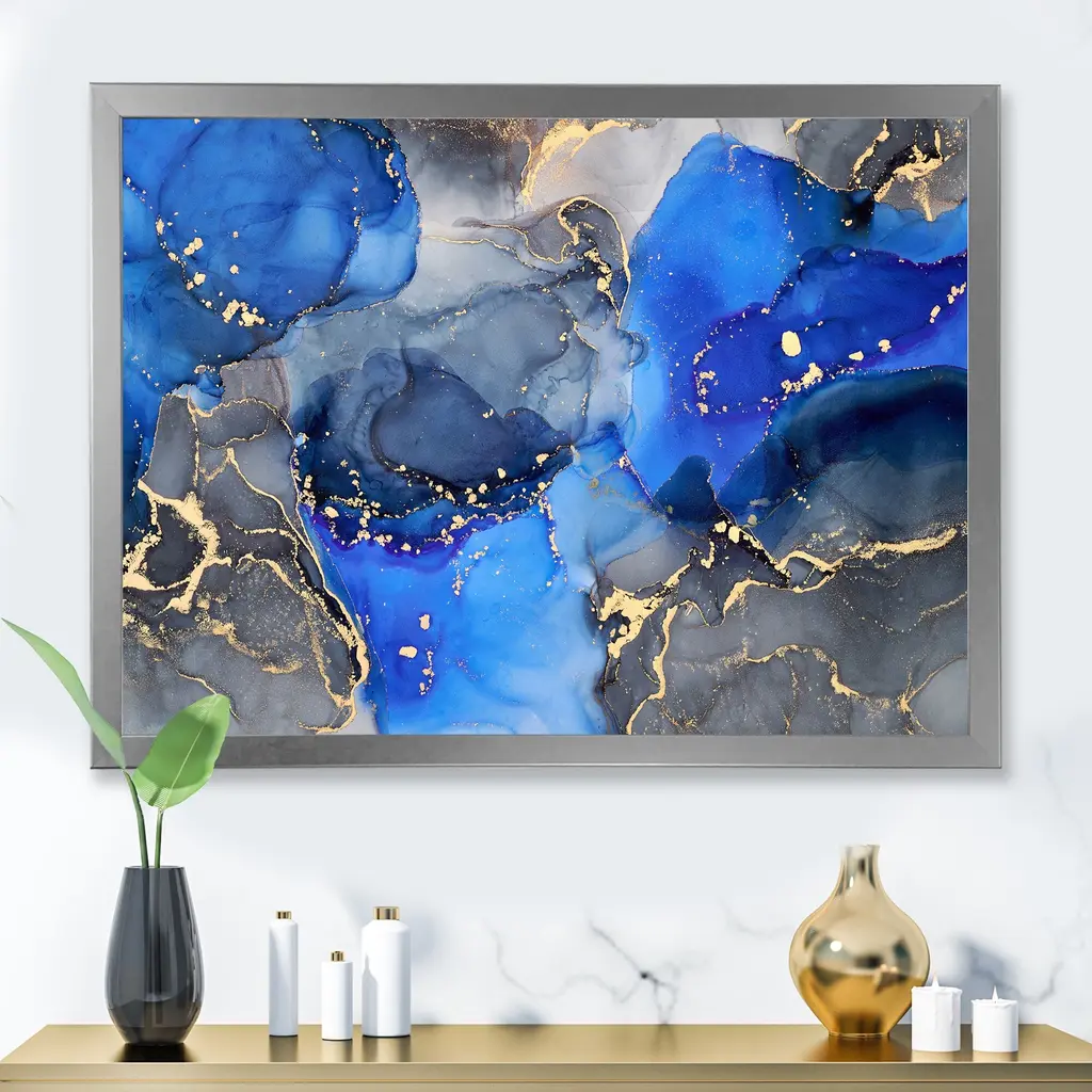 Designart "Blue And Black Luxury Abstract Fluid Art I" Modern Framed Art Print - 20 In. Wide X 12 In. High - Gold