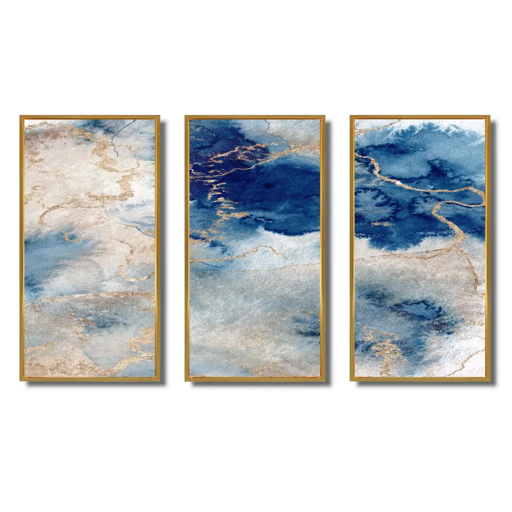 This beautiful Blue And Gold Marble Clouds III 3 Panels Framed Canvas Art is printed using the highest quality fade-resistant ink on canvas. Every one of our fine art giclee canvas prints is printed on premium quality canvas, using the finest quality inks which will not fade over time. Each giclee print is stretched tightly over a 1-inch wood sub frame ensuring the canvas is taught and does not buckle. The canvas print is inserted into a wood floating frame. All of our Framed canvas prints are carefully packaged with corner protection, fragile labeling and sturdy boxes to ensure safe delivery. Every framed canvas print arrives ready to hang on the wall, with the hanging kits included. This framed art print is available in many different color frames. Features: - Style : Modern & Contemporary - Subject : Abstract, - Color : Blue - Premium quality cotton canvas. - Arrives ready to hang on the wall - Easy to Hang