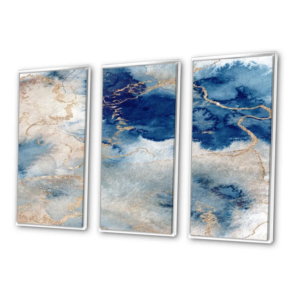 This beautiful Blue And Gold Marble Clouds III 3 Panels Framed Canvas Art is printed using the highest quality fade-resistant ink on canvas. Every one of our fine art giclee canvas prints is printed on premium quality canvas, using the finest quality inks which will not fade over time. Each giclee print is stretched tightly over a 1-inch wood sub frame ensuring the canvas is taught and does not buckle. The canvas print is inserted into a wood floating frame. All of our Framed canvas prints are carefully packaged with corner protection, fragile labeling and sturdy boxes to ensure safe delivery. Every framed canvas print arrives ready to hang on the wall, with the hanging kits included. This framed art print is available in many different color frames. Features: - Style : Modern & Contemporary - Subject : Abstract, - Color : Blue - Premium quality cotton canvas. - Arrives ready to hang on the wall - Easy to Hang