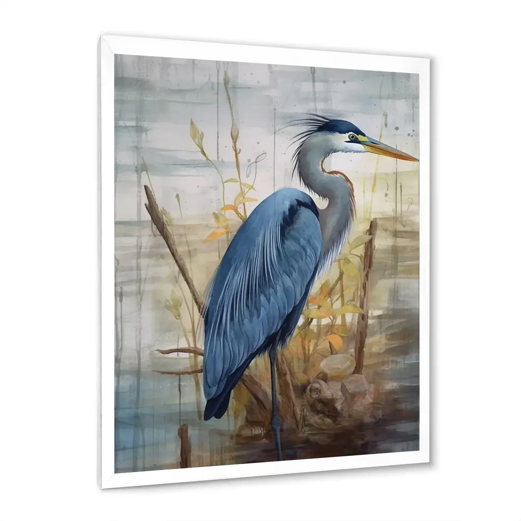 Designart "Blue Heron By The Watersite Watercolor I" Animals Bird Framed Wall Art Living Room - 12 In. Wide X 20 In. High - White