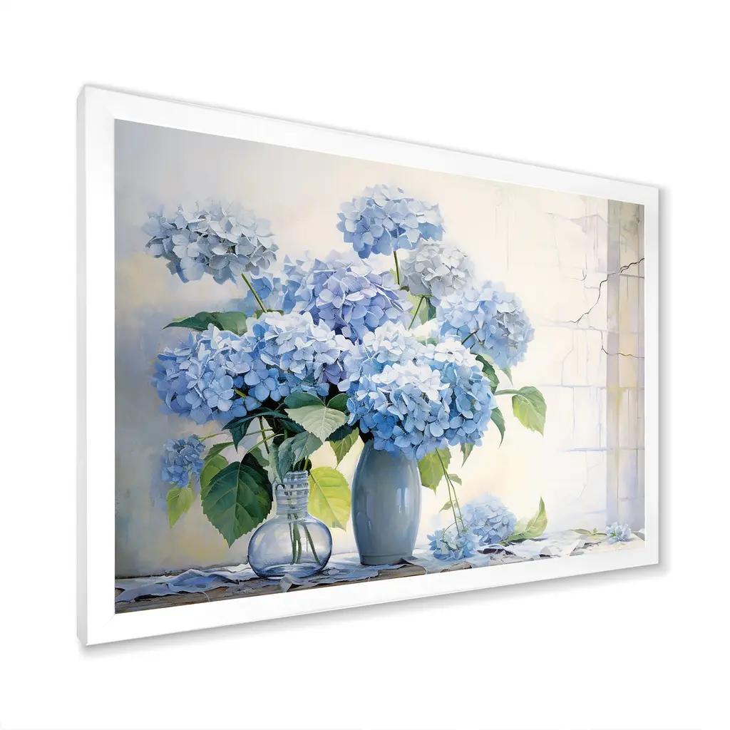 Designart "Blue Hydrangea Farmhouse Still Life " Hydrangea Framed Canvas Wall Art - 20 In. Wide X 12 In. High - White
