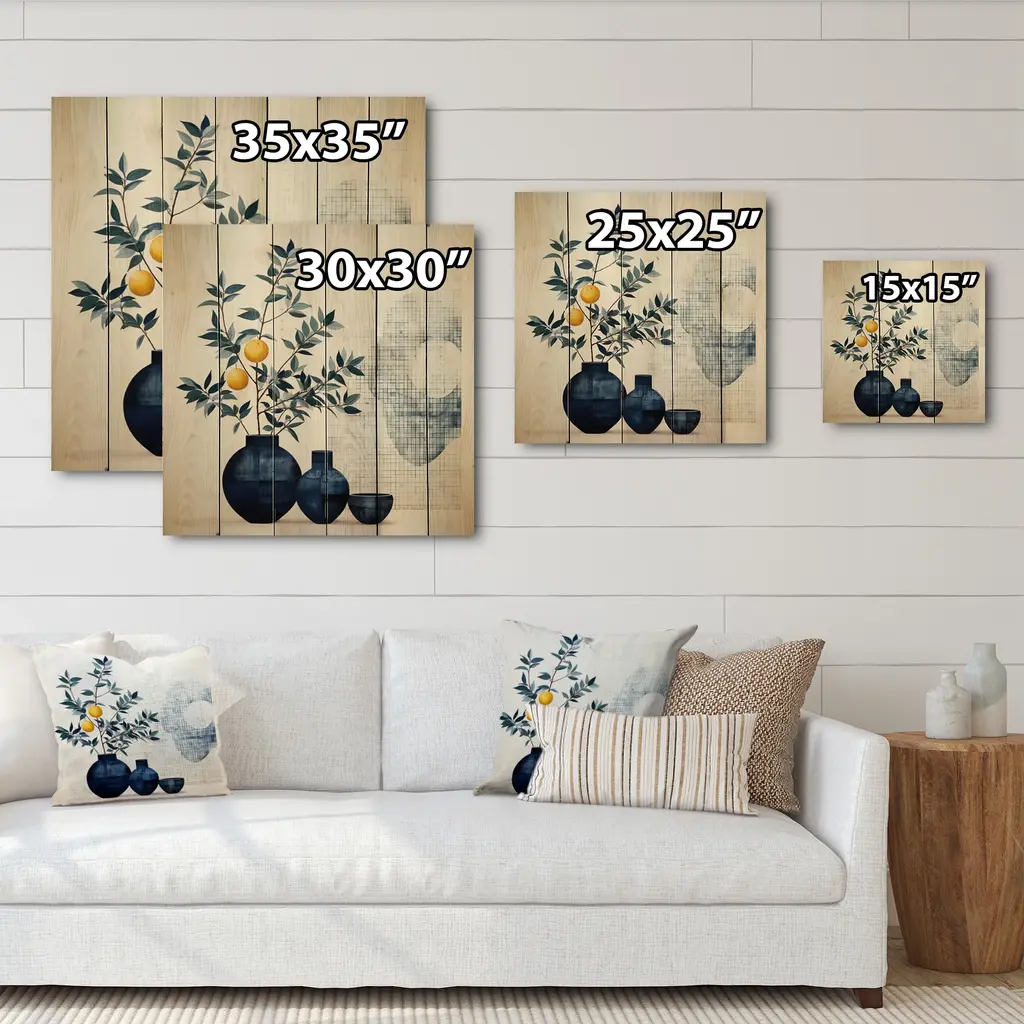Designart "Blue Yellow Mid Century Minimalist Pottery" Abstract Still Lifes Print On Natural Pine Wood - 25 In. Wide X 25 In. High