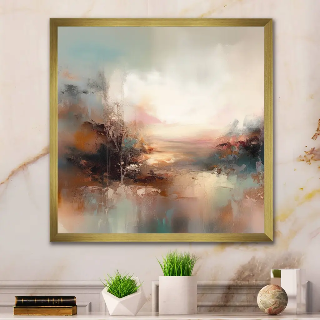 Designart "Brown Abstracted Nature I" Abstract Landscape Framed Wall Art For Living Room - 24 In. Wide X 24 In. High - Gold