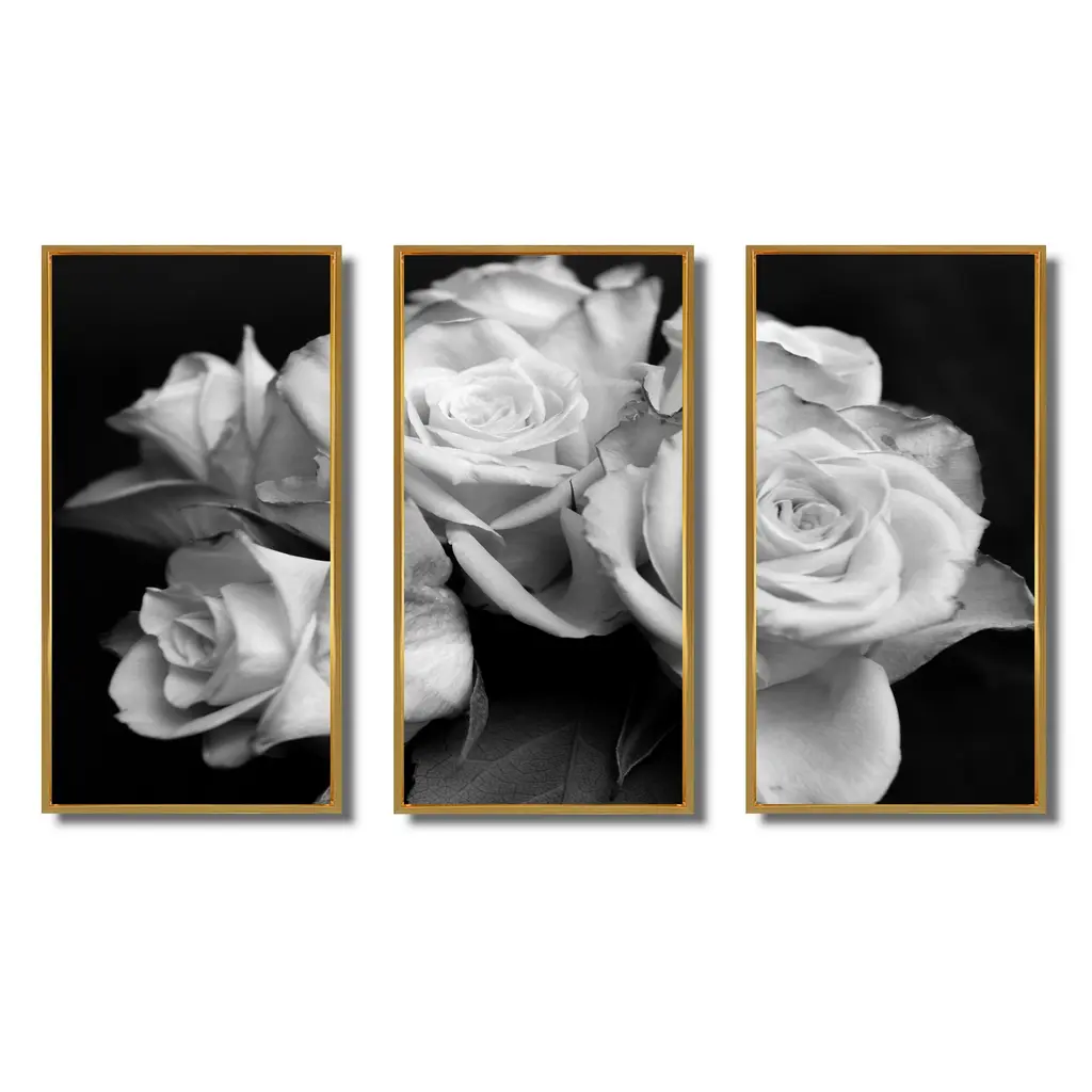 Designart "Bunch Of Roses Black And White" Floral Framed Wall Decor Set Of 3 - 4 Colors Of Frames - 36 In. Wide X 20 In. High - 3 Panels - Gold