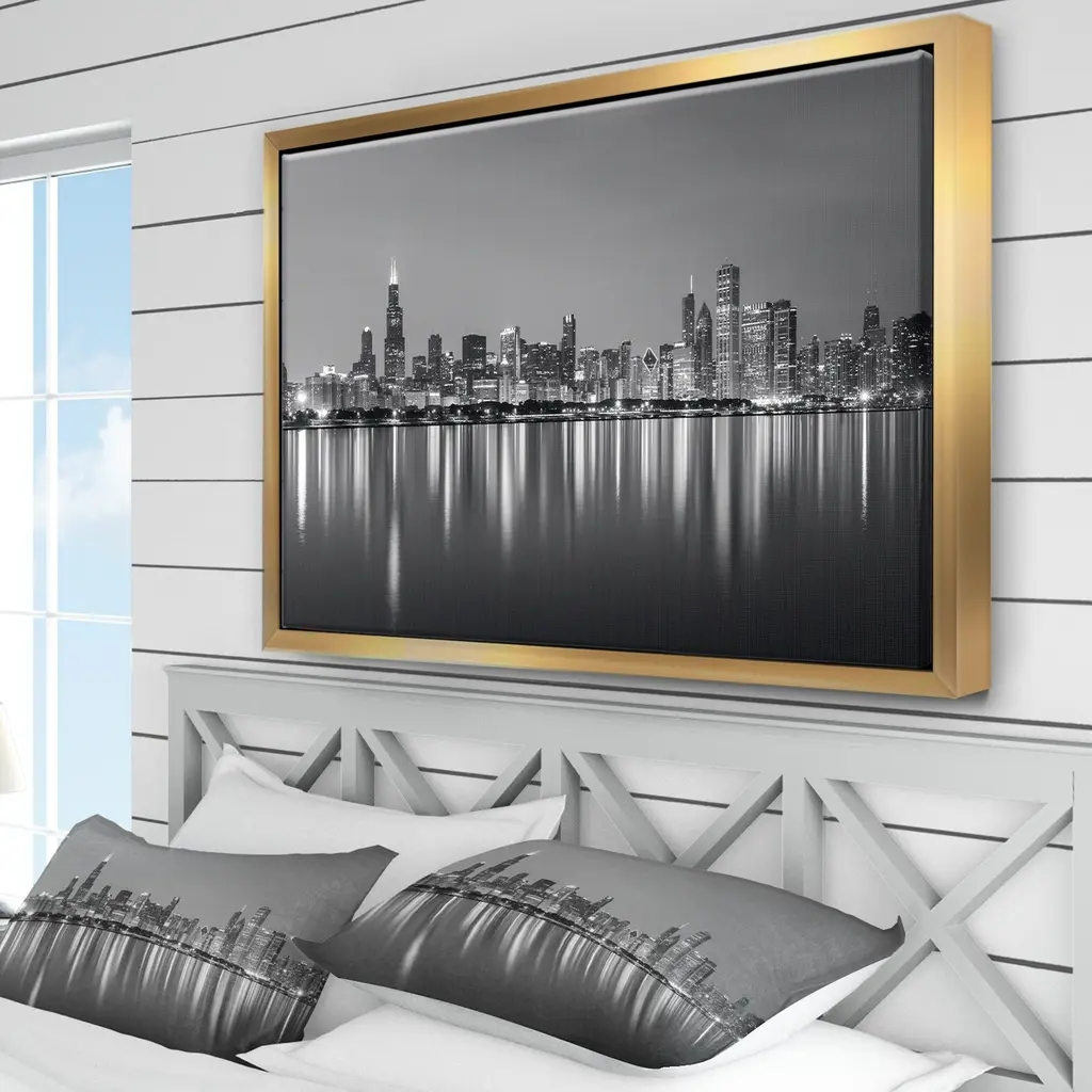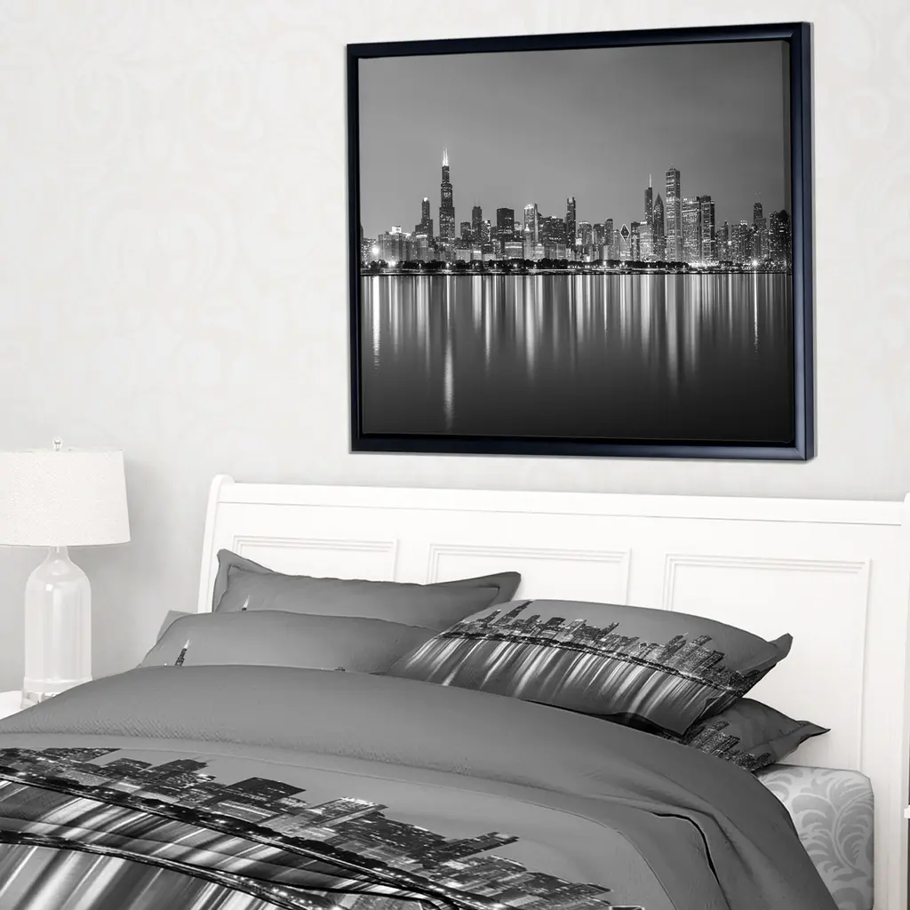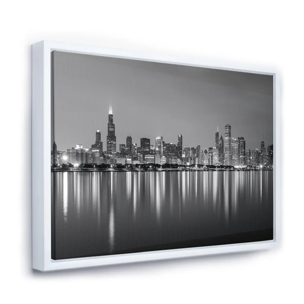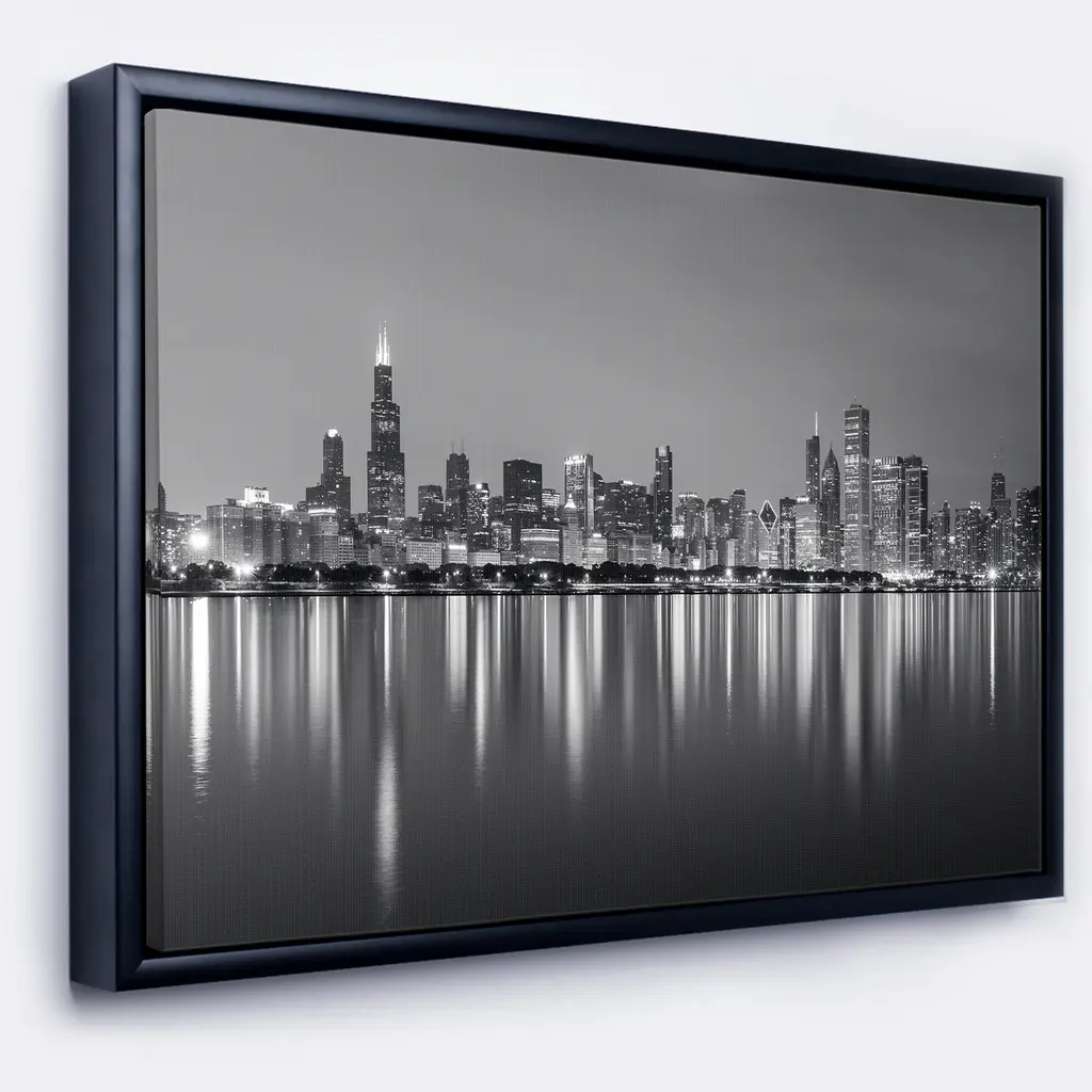 Bring more drama and excitement to your interior with this cityscape canvas print entitled 'Chicago Skyline at Night Black and White.' Printed on premium quality canvas, this giclee artwork creates the illusion of another window in your home. A slim black wood frame helps keep the look clean and refined.