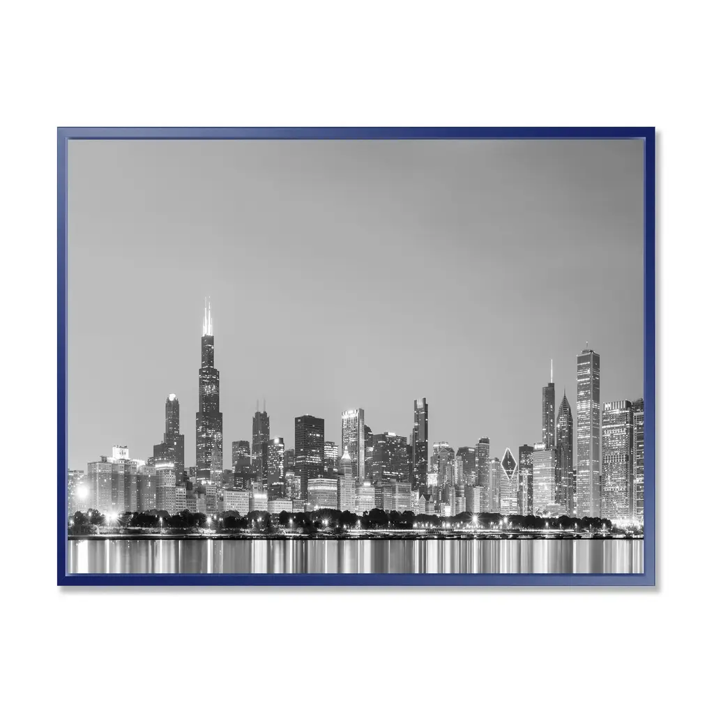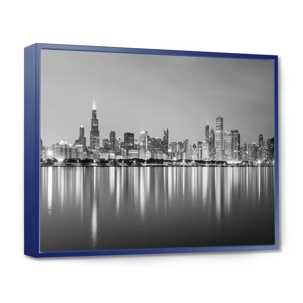 Designart "Chicago Skyline At Night Black And White" Cityscape Framed Canvas Print - 40 In. Wide X 30 In. High - Blue