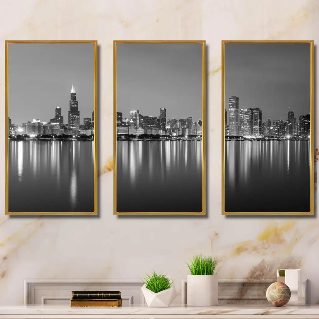 Designart "Chicago Skyline At Night Black And White" Cityscape Framed Wall Decor Set Of 3 - 4 Colors Of Frames - 36 In. Wide X 20 In. High - 3 Panels - White