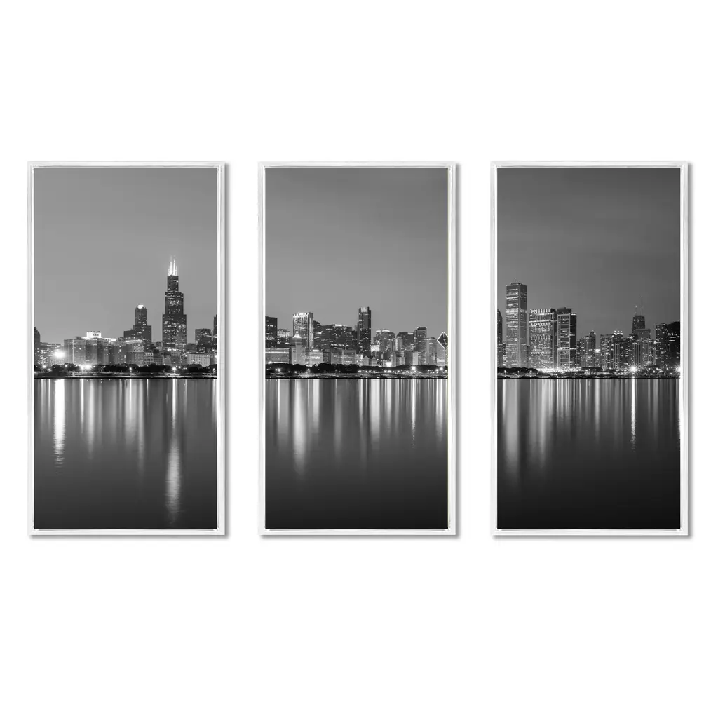 Designart "Chicago Skyline At Night Black And White" Cityscape Framed Wall Decor Set Of 3 - 4 Colors Of Frames - 36 In. Wide X 28 In. High - 3 Panels - White