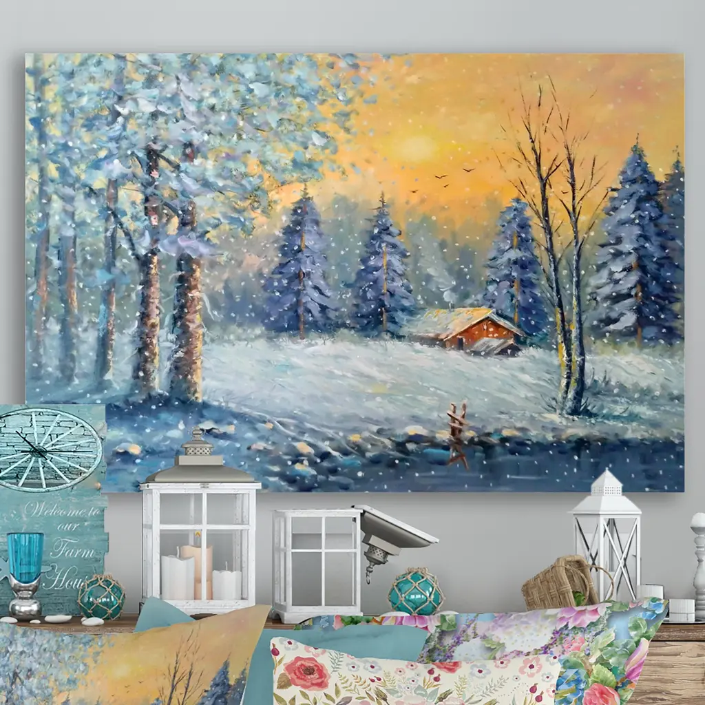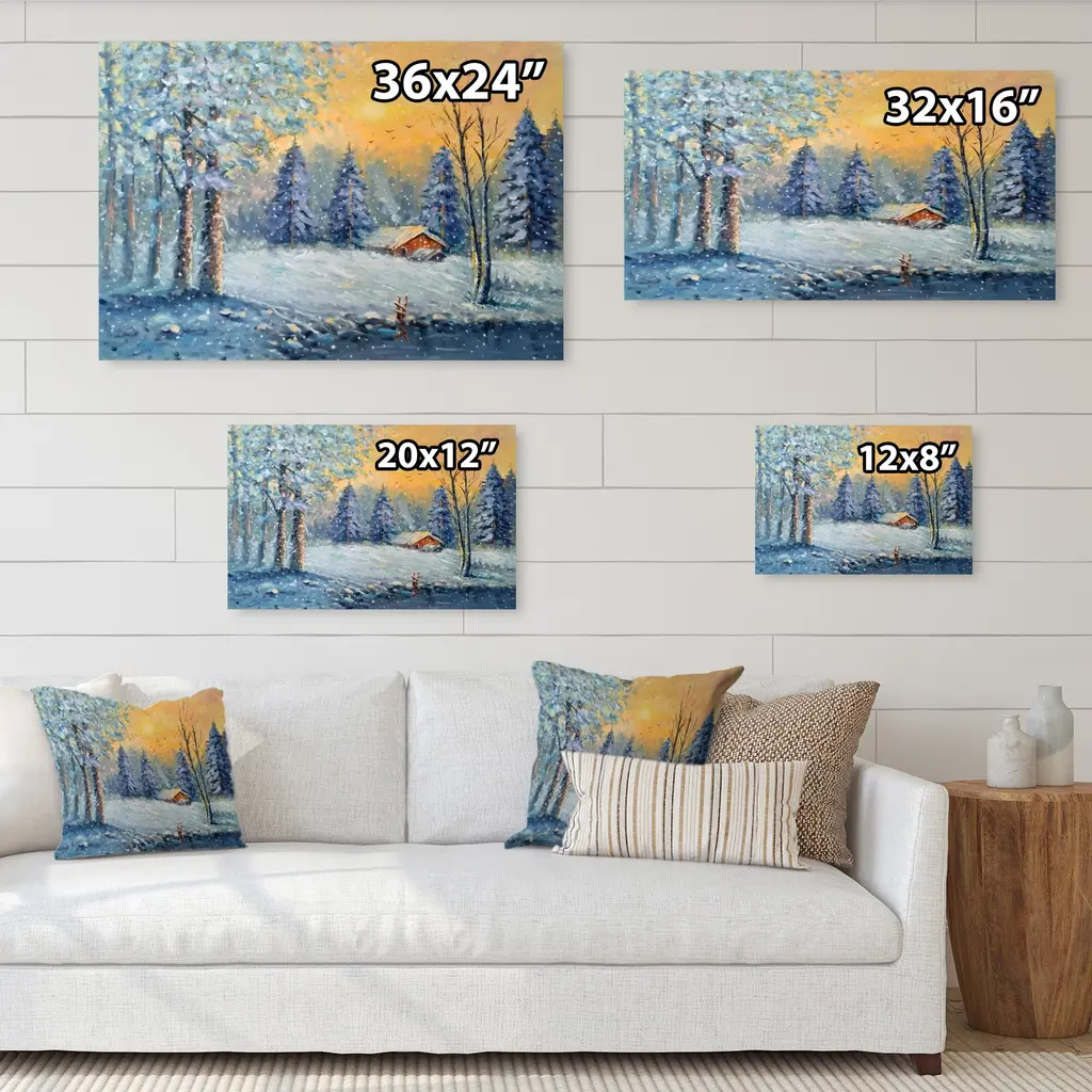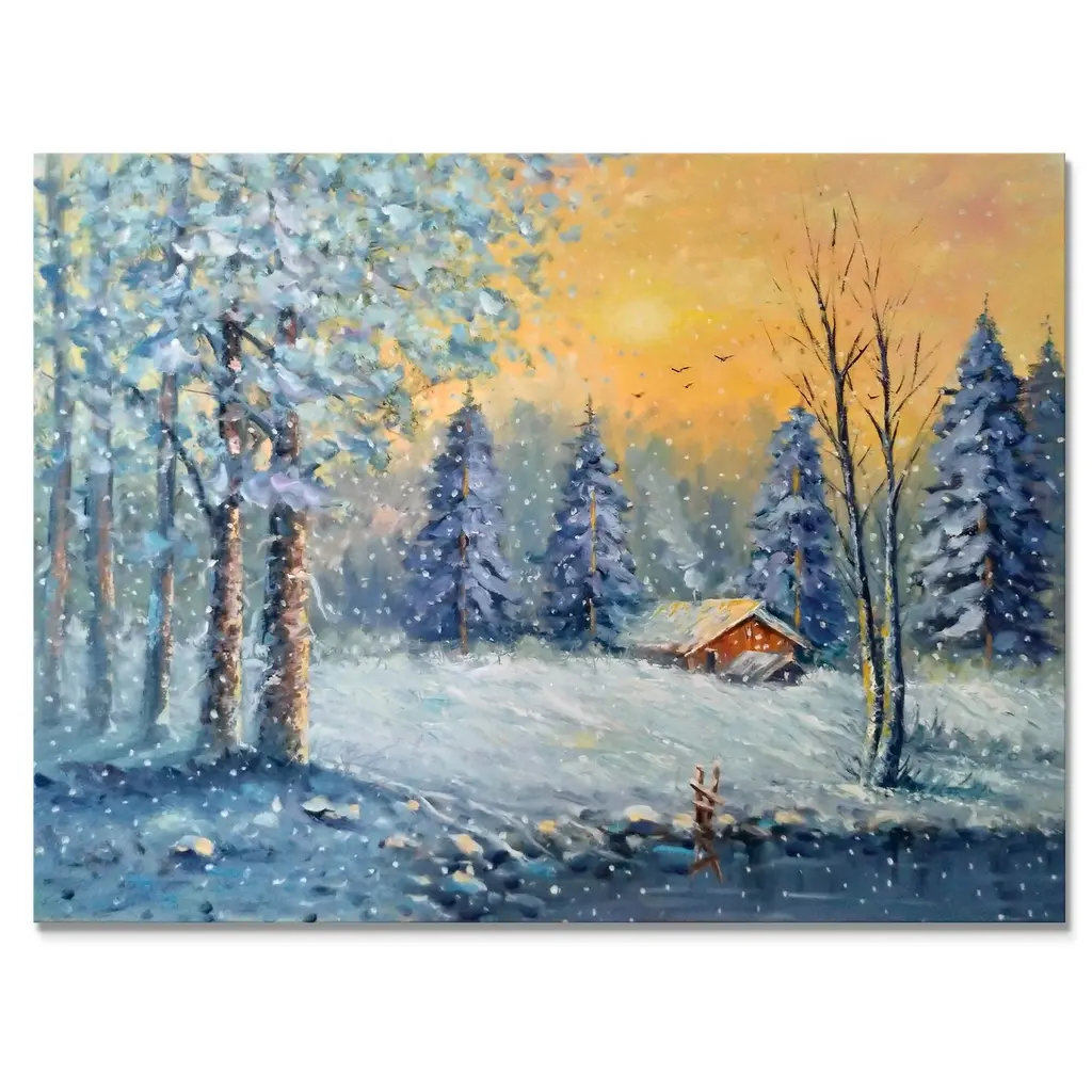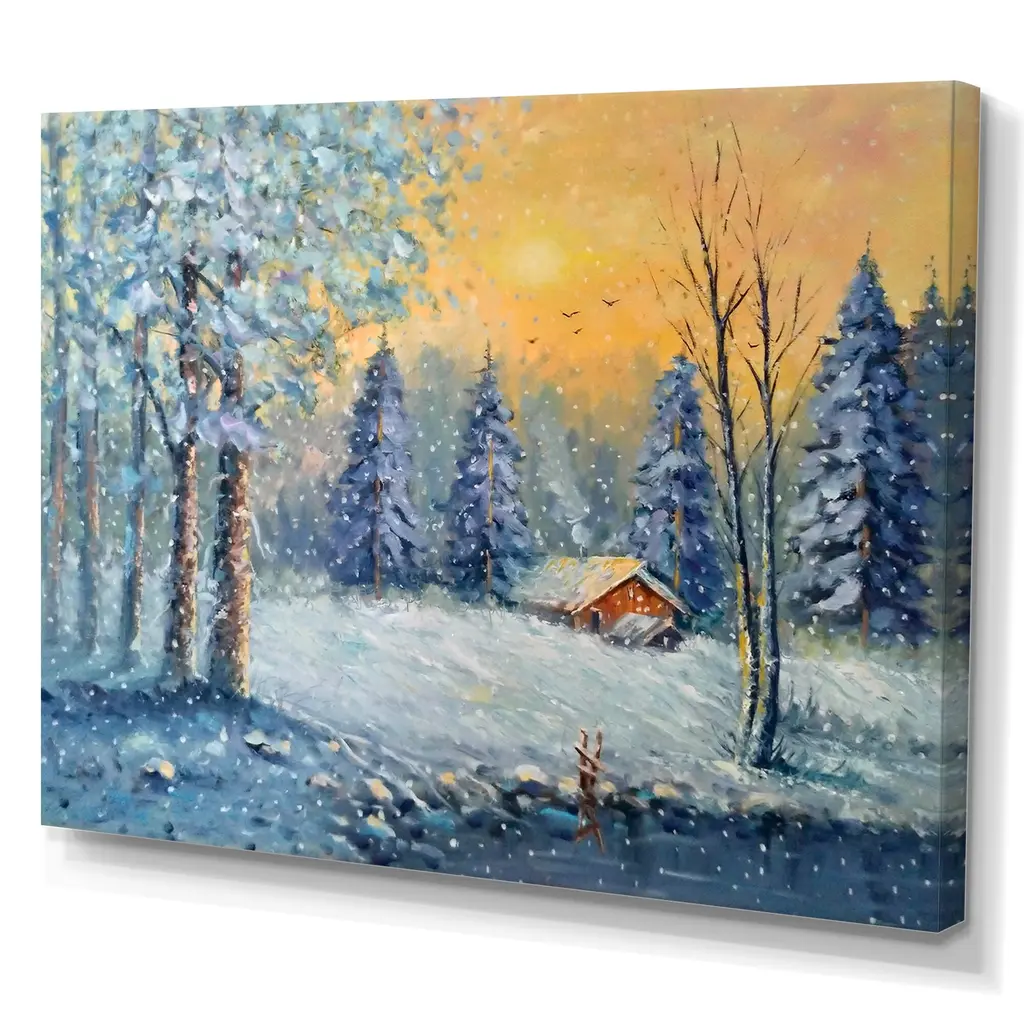 This beautiful Cottage In Forest During Christmas Canvas Art is printed using the highest quality fade resistant ink on canvas. Every one of our fine art giclee canvas prints is printed on premium quality cotton canvas, using the finest quality inks which will not fade over time. Each giclee print is stretched tightly over a 1 inch wood sub frame for small size prints or a 1.5 inch wood sub frame for large size prints (40x30 60x28 ...) ensuring the canvas is taught and does not buckle. This canvas art print is gallery-wrapped (the design continues on the sides) , giving it a real art gallery feel. All of our canvas prints are carefully packaged with plastic protection, fragile labeling and sturdy boxes to ensure a safe delivery. Every canvas print arrives ready to hang on the wall, with the hanging kits included. - Style : Traditional - Subject : Landscapes, Landscape & Nature, SunriseSunset - Color : Blue - This canvas giclee print is gallery-wrapped (the design continues on the sides) , giving it a real art gallery feel. - Premium quality cotton canvas. - Arrives ready to hang on the wall - Easy to Hang