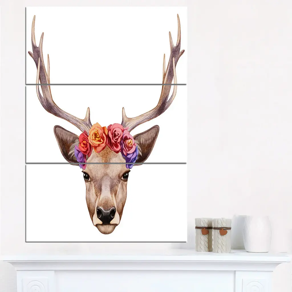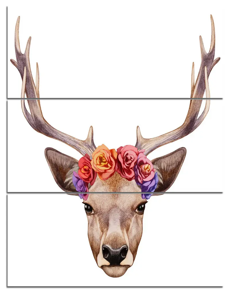 "Designart-Deer Portrait With Floral Head" Metal Wall Art, 3 Panels, 28"x36"