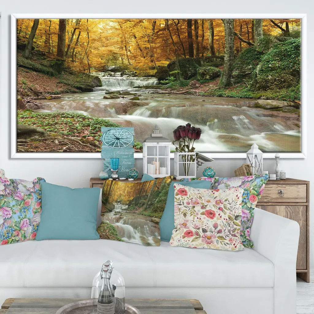 Infuse tranquility into your room by hanging this 'Forest Waterfall with Yellow Trees' canvas print. This ethereal depiction of a beautiful mountain stream babbling along through a forest pass comes rendered in fade-resistant ink on premium canvas, creating a vibe of serenity wherever it's hung. The black frame provides an elegant finish to this exquisite artwork.