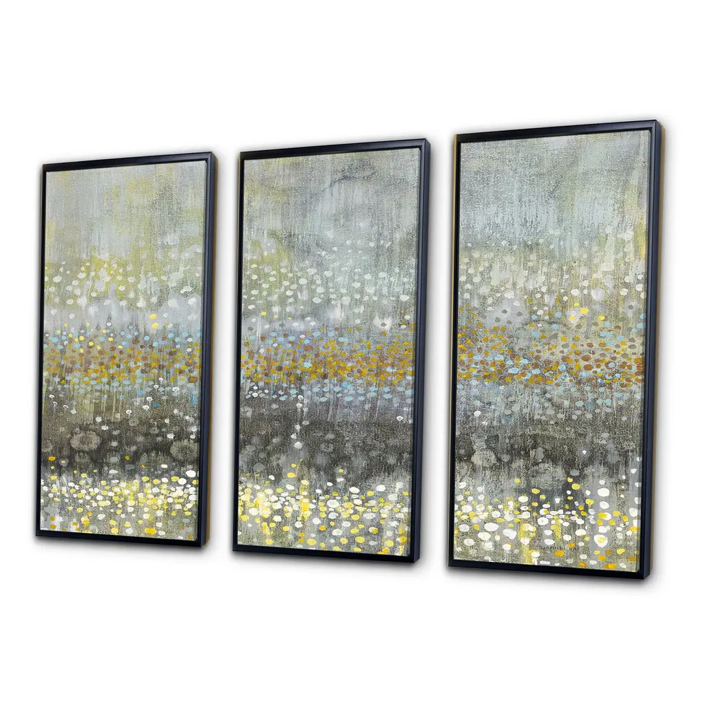 This beautiful Glam Rain Abstract III 3 Panels Framed Canvas Art is printed using the highest quality fade-resistant ink on canvas. Every one of our fine art giclee canvas prints is printed on premium quality canvas, using the finest quality inks which will not fade over time. Each giclee print is stretched tightly over a 1-inch wood sub frame ensuring the canvas is taught and does not buckle. The canvas print is inserted into a wood floating frame. All of our Framed canvas prints are carefully packaged with corner protection, fragile labeling and sturdy boxes to ensure safe delivery. Every framed canvas print arrives ready to hang on the wall, with the hanging kits included. This framed art print is available in many different color frames. Features: - Style : Modern & Contemporary - Subject : Abstract, - Color : Multi-Color - Premium quality cotton canvas. - Arrives ready to hang on the wall - Easy to Hang