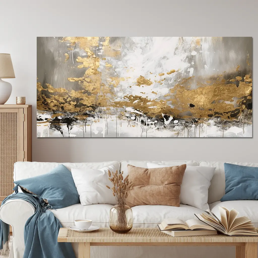 This beautiful Gold and White Abstract Canvas Art is printed using the highest quality fade resistant ink on canvas. Every one of our fine art giclee canvas prints is printed on premium quality cotton canvas, using the finest quality inks which will not fade over time. Each giclee print is stretched tightly over a 1 inch wood sub frame for small size prints or a 1.5 inch wood sub frame for large size prints (40x30 60x28 ...) ensuring the canvas is taught and does not buckle. This canvas art print is gallery-wrapped (the design continues on the sides) , giving it a real art gallery feel. All of our canvas prints are carefully packaged with plastic protection, fragile labeling and sturdy boxes to ensure a safe delivery. Every canvas print arrives ready to hang on the wall, with the hanging kits included. - Style : Modern & Contemporary - Subject : Abstract - Color : White, Gold - This canvas giclee print is gallery-wrapped (the design continues on the sides) , giving it a real art gallery feel. - Premium quality cotton canvas. - Arrives ready to hang on the wall - Easy to Hang
