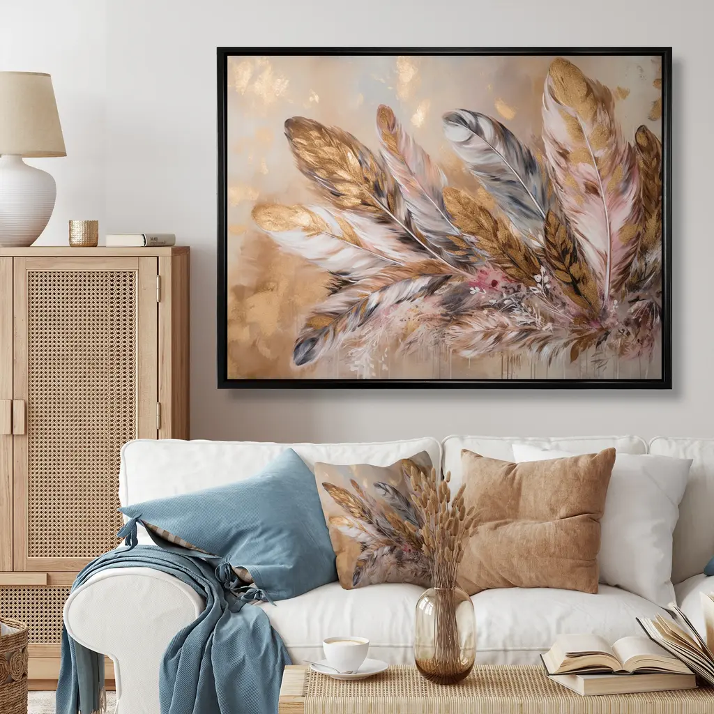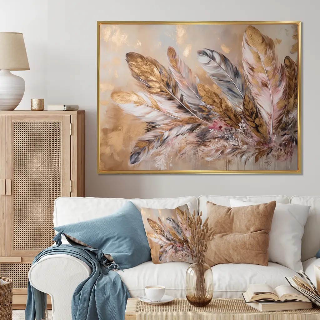 This beautiful Gold Feather Boho Majesty Framed Canvas Art is printed using the highest quality fade-resistant ink on canvas. Every one of our fine art giclee canvas prints is printed on premium quality canvas, using the finest quality inks which will not fade over time. Each giclee print is stretched tightly over a 1.5-inch wood sub frame ensuring the canvas is taught and does not buckle. The canvas print is inserted into a wood floating frame. All of our Framed canvas prints are carefully packaged with corner protection, fragile labeling and sturdy boxes to ensure safe delivery. Every framed canvas print arrives ready to hang on the wall, with the hanging kits included. This framed art print is available in many different color frames. Features: - Style : Modern & Contemporary, Glam - Subject : Floral - Color : Gold - Premium quality cotton canvas. - Arrives ready to hang on the wall - Easy to Hang